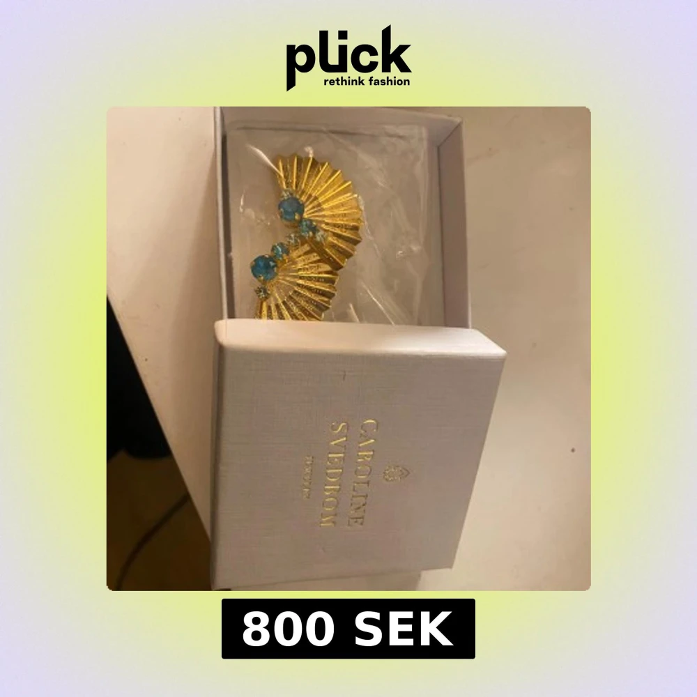 Unika örhängen från Caroline Svedbom i form av solfjädrar i guldton med blå gnistrande stenar. De har en cool, veckad design och detaljerade mönster på metallen. Perfekta för dig som vill sticka ut med ett statement-smycke.