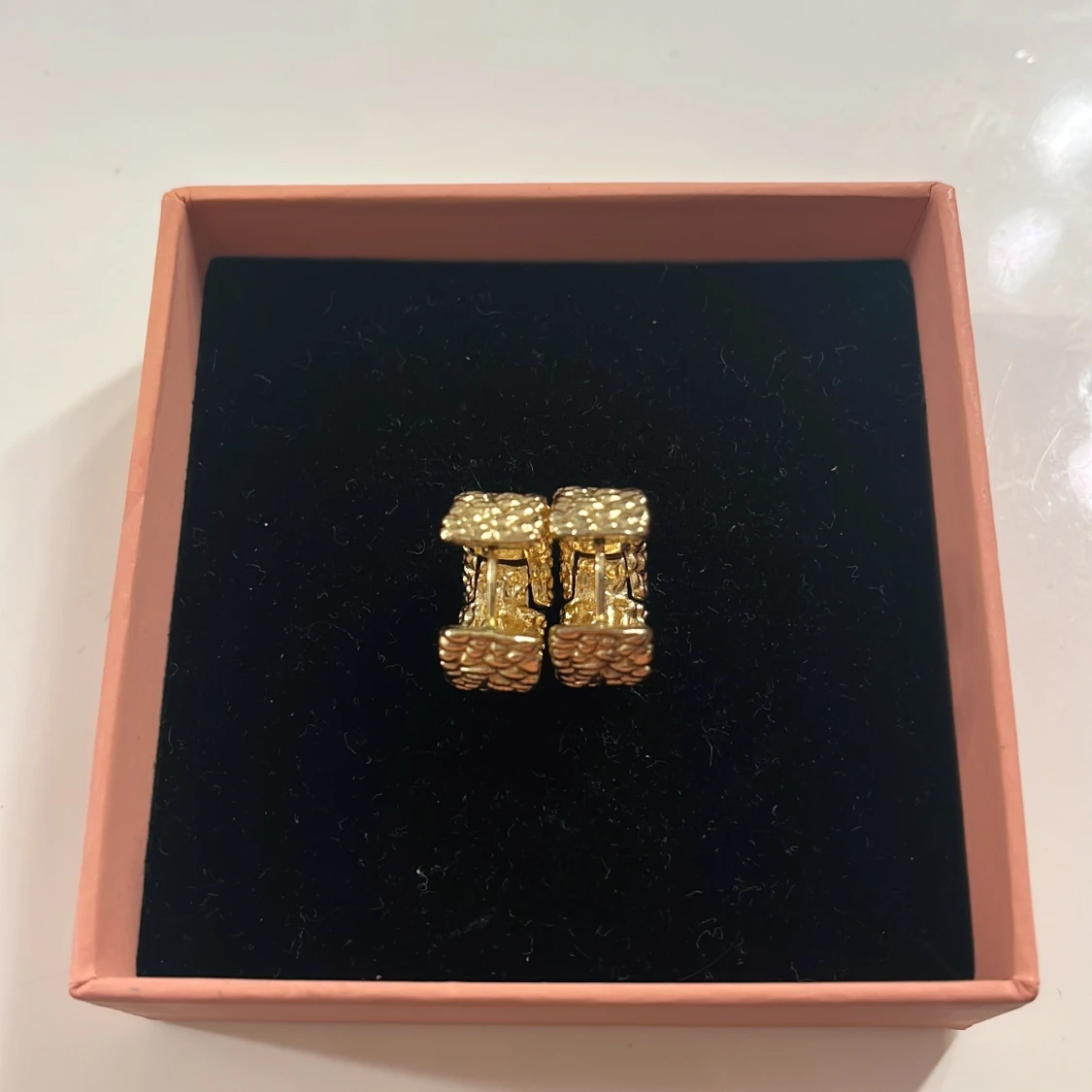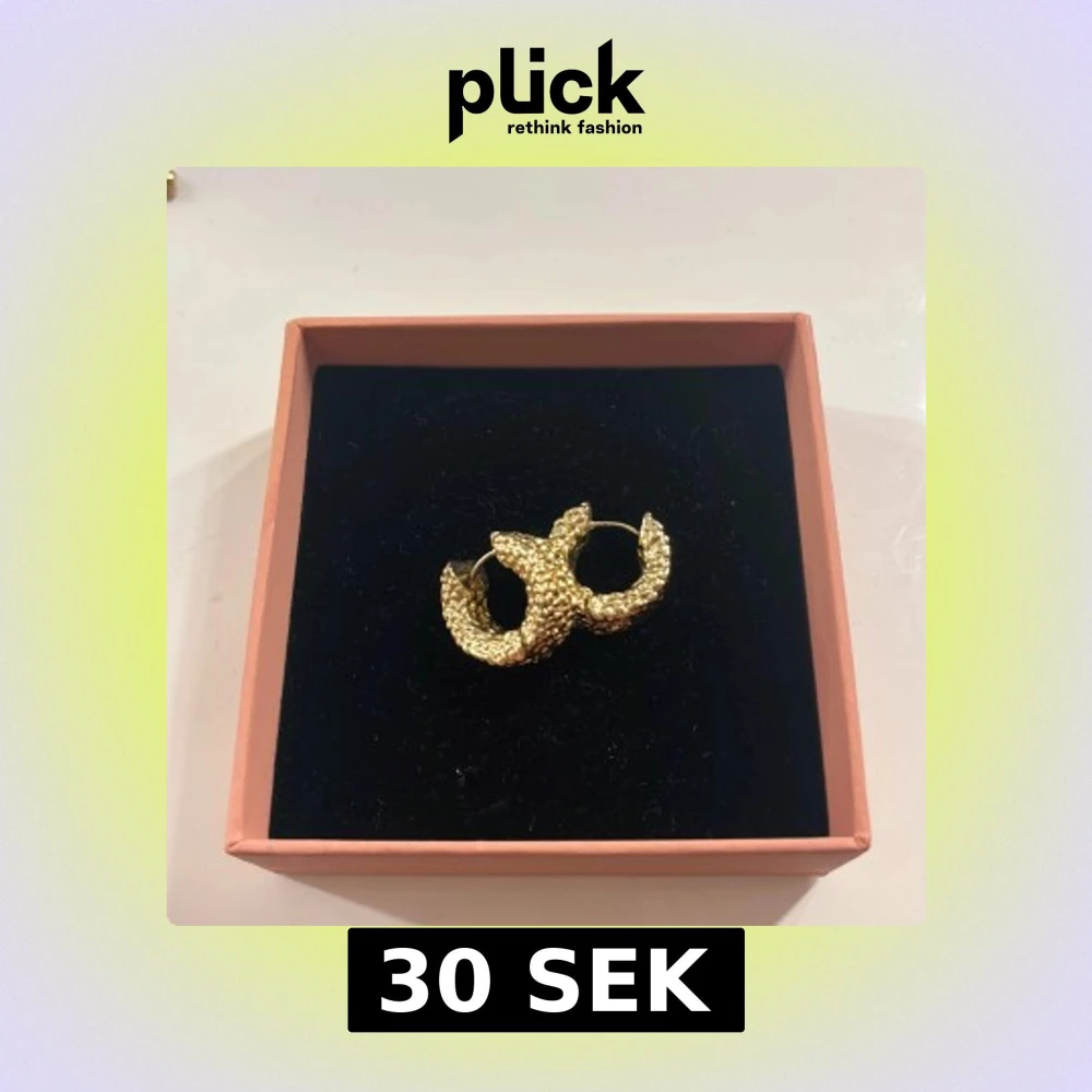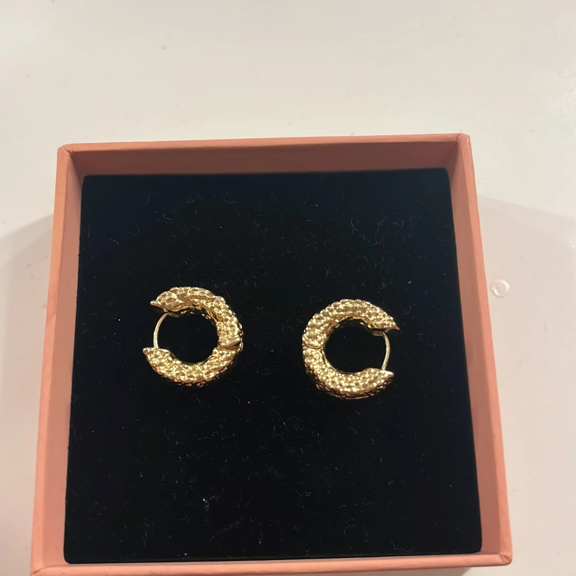 Guldiga örhängen från glitter, inge rost. Spännena passade ej mina öron och kunde därför öppnas därav säljer jag dom❤️använda 1 gång.