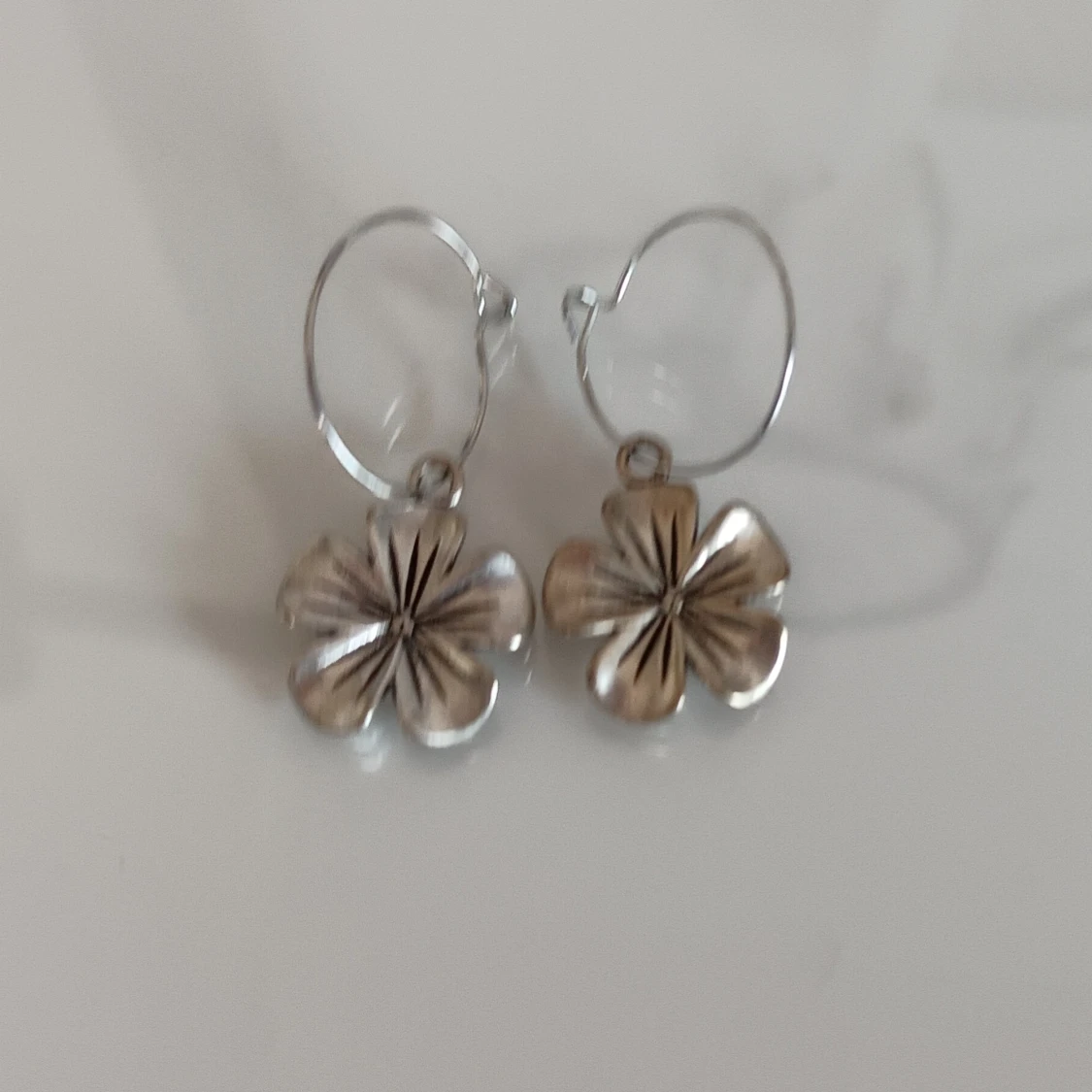 Ett par coola silvriga örhängen med stora blommor som hänger i tunna ringar. Blommorna har tydliga detaljer och ger en unik och trendig look. Perfekta för dig som vill sticka ut med ett smycke som känns både stilrent och lekfullt.