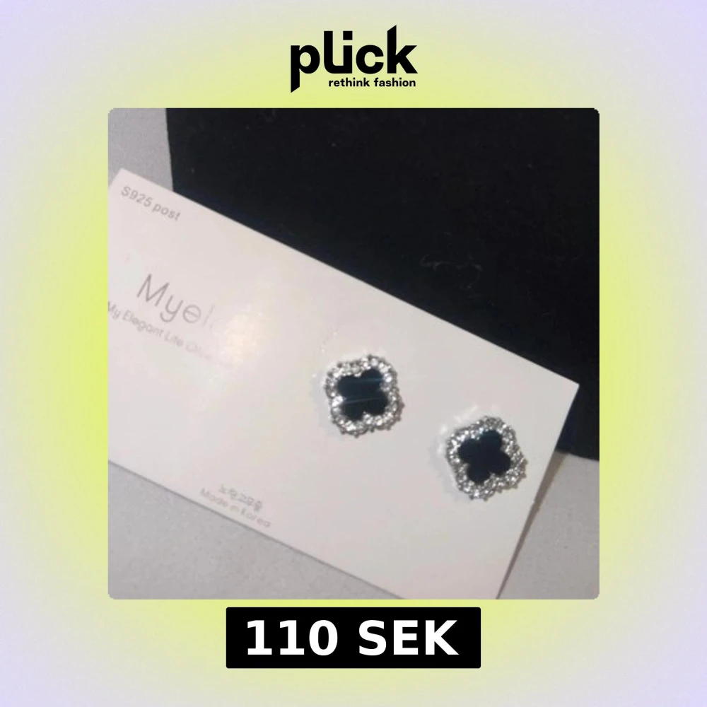 Snygga örhängen från Myeluc med svart fyrklöverformad sten omgiven av glittriga silvriga detaljer. Perfekt för dig som gillar stilrena accessoarer med lite extra bling. S925 post, tillverkade i Korea.