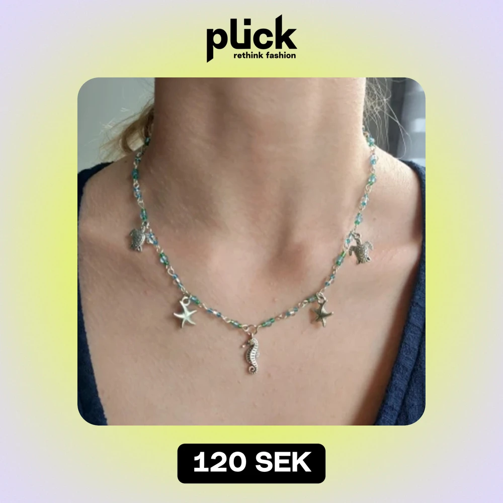Handgjort silver halsband med sjöhäst, sjöstjärna, sköldpadda och blågröna pärlor🌊🌙 Kan skickas eller hämtas, vi står ej för frakt😇