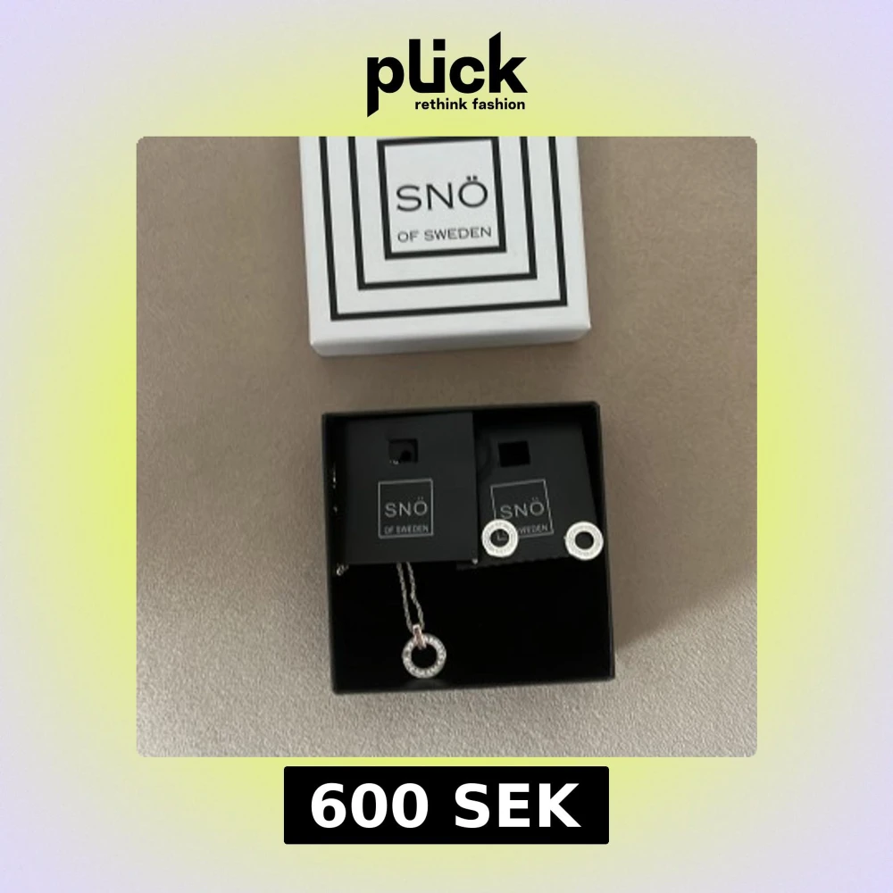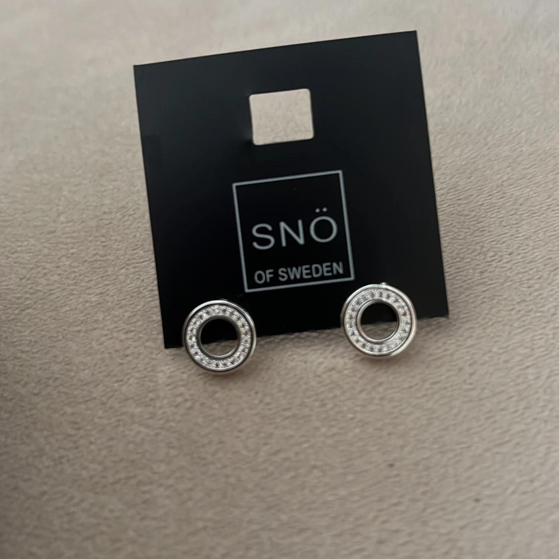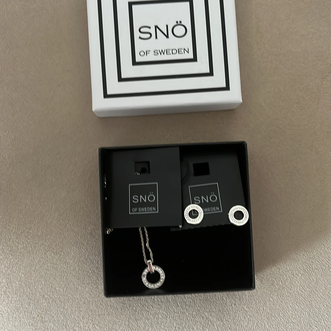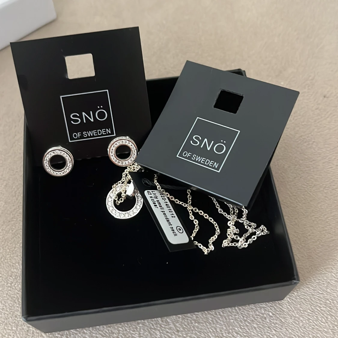 (Helt ny och oanvänd )Elegant smyckeset från SNÖ of Sweden som inkluderar ett par silverfärgade örhängen och ett matchande halsband. Båda smyckena har en cirkulär design med glittrande detaljer som ger en lyxig känsla. Perfekt för att komplettera din look med stil. PRIS KAN DISKUTERAS 💗
