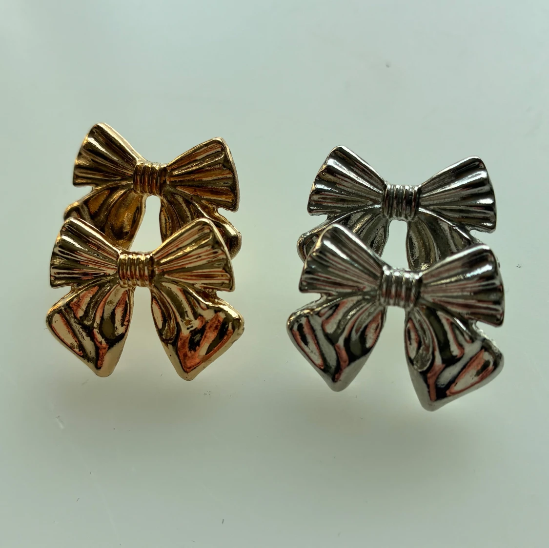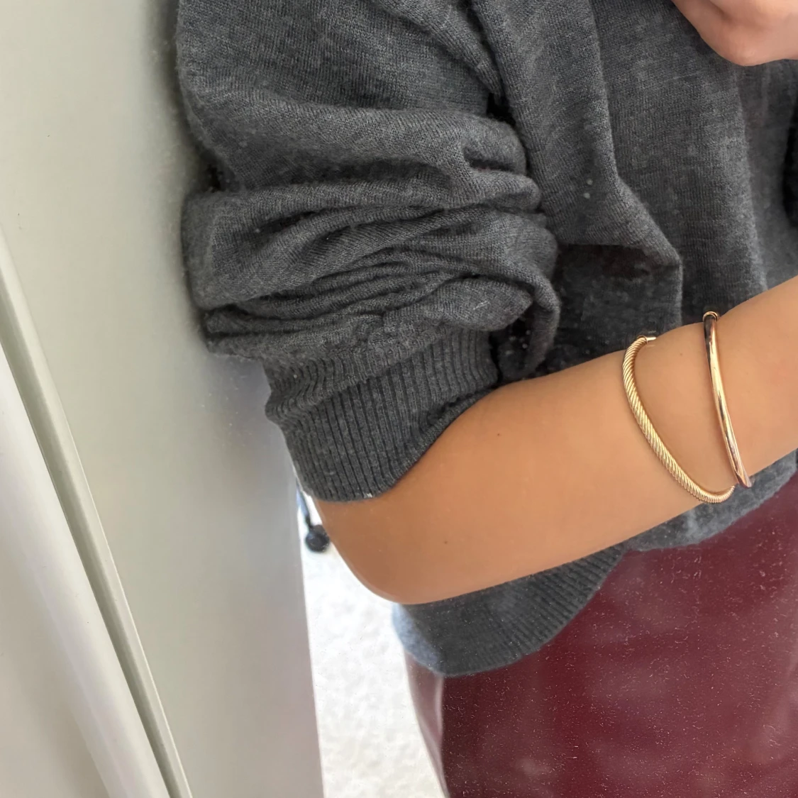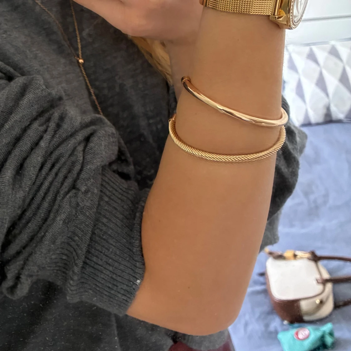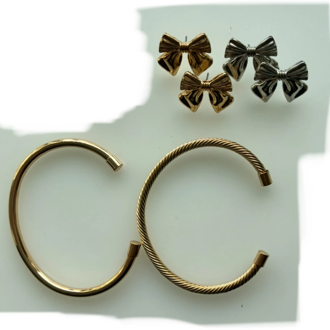 Säljer ett smyckeset med två öppna armband i guld, ett slätt samt ett tvinnat och två par rosettformade örhängen i både guld och silver. Armbanden kommer från hm, örhängena från Ur och Penn!