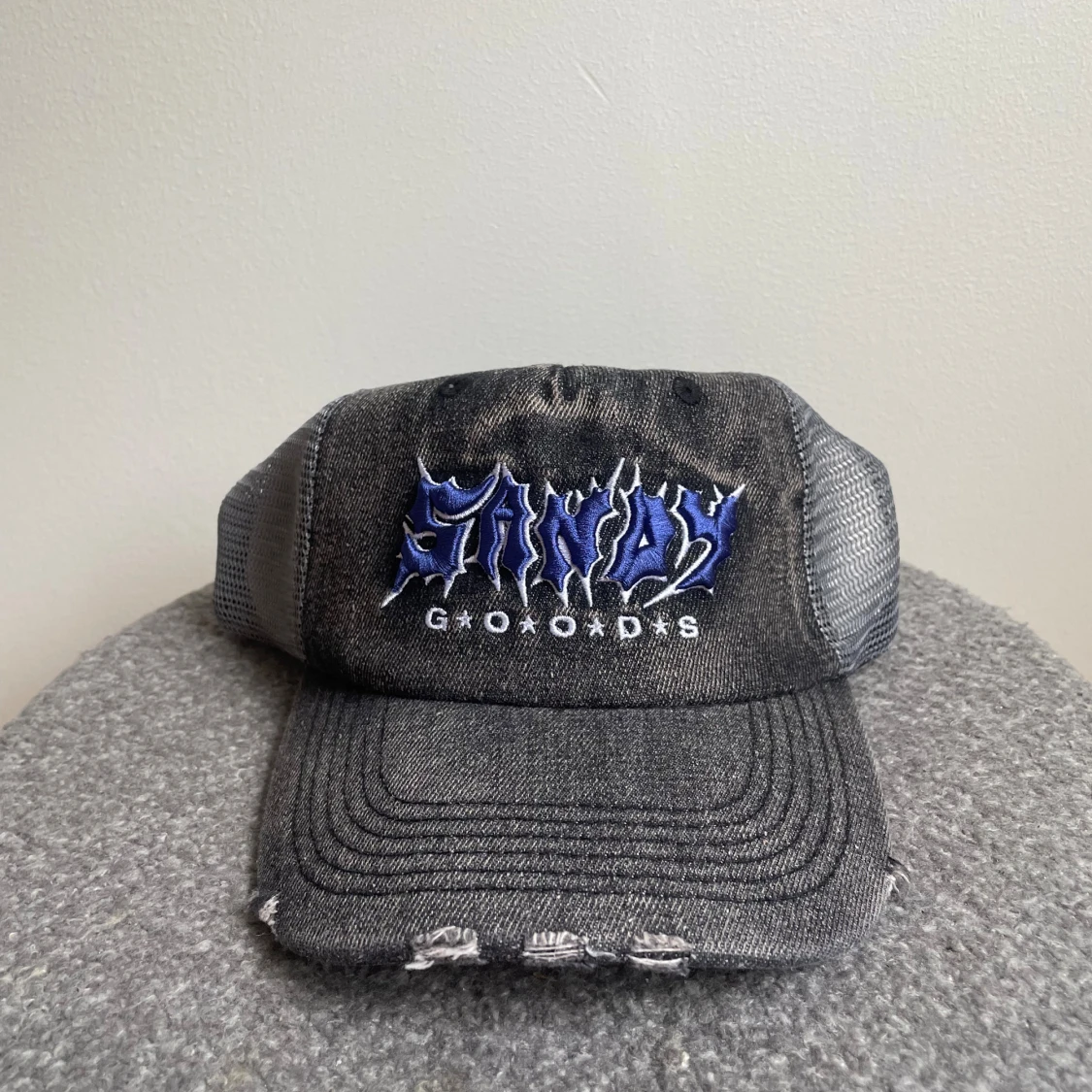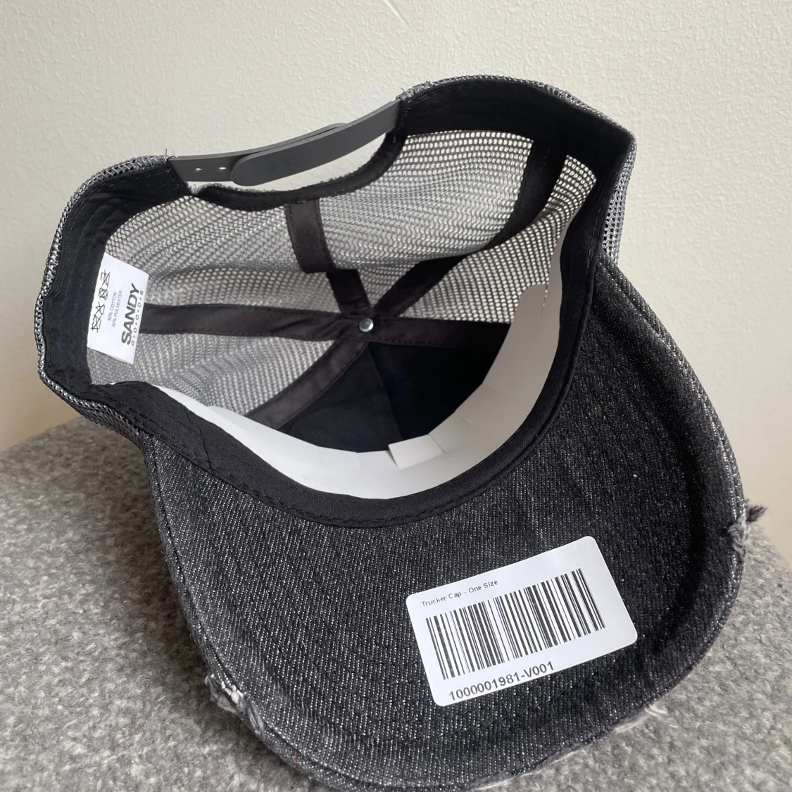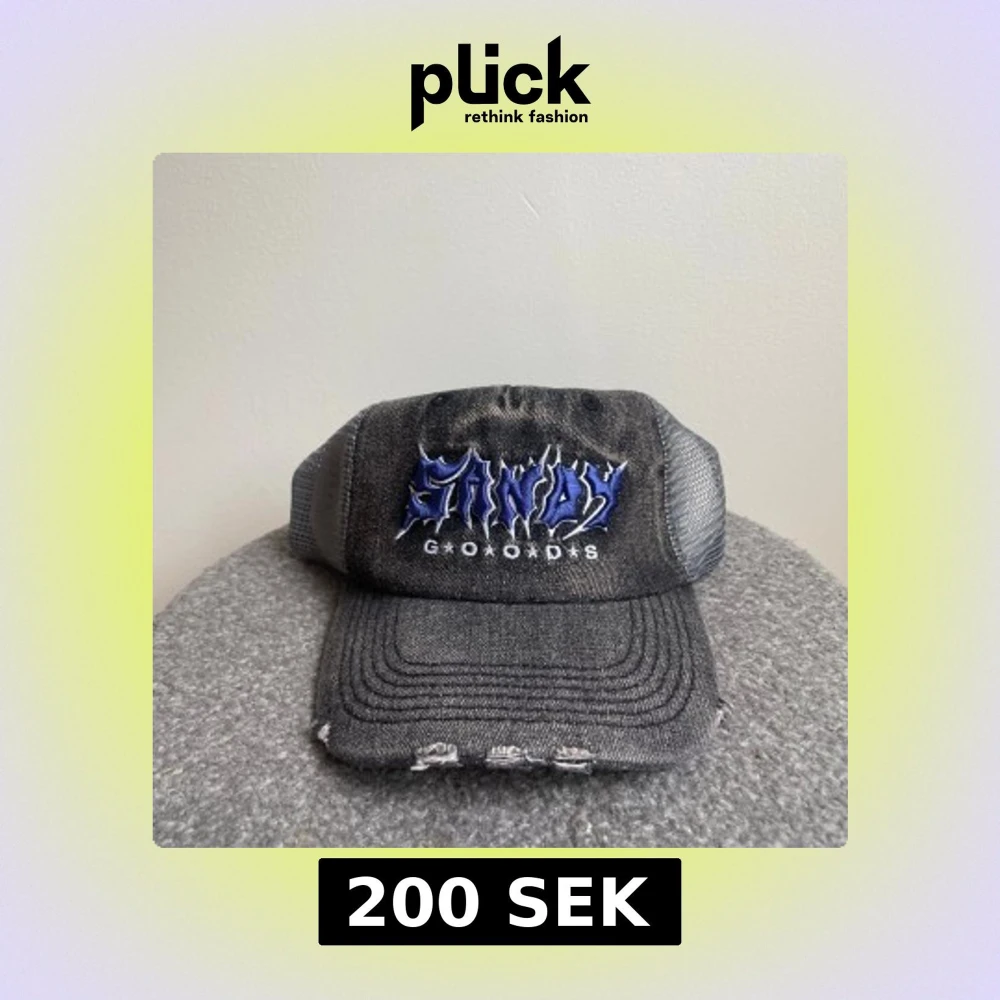 Snygg urtvättad svart truckerkeps med justerbar snapback. Framtill har kepsen ett broderat lila och vitt Sandy Goods-logo. Framsidan är i denim-look med slitna detaljer på skärmen. Helt ny, aldrig använd