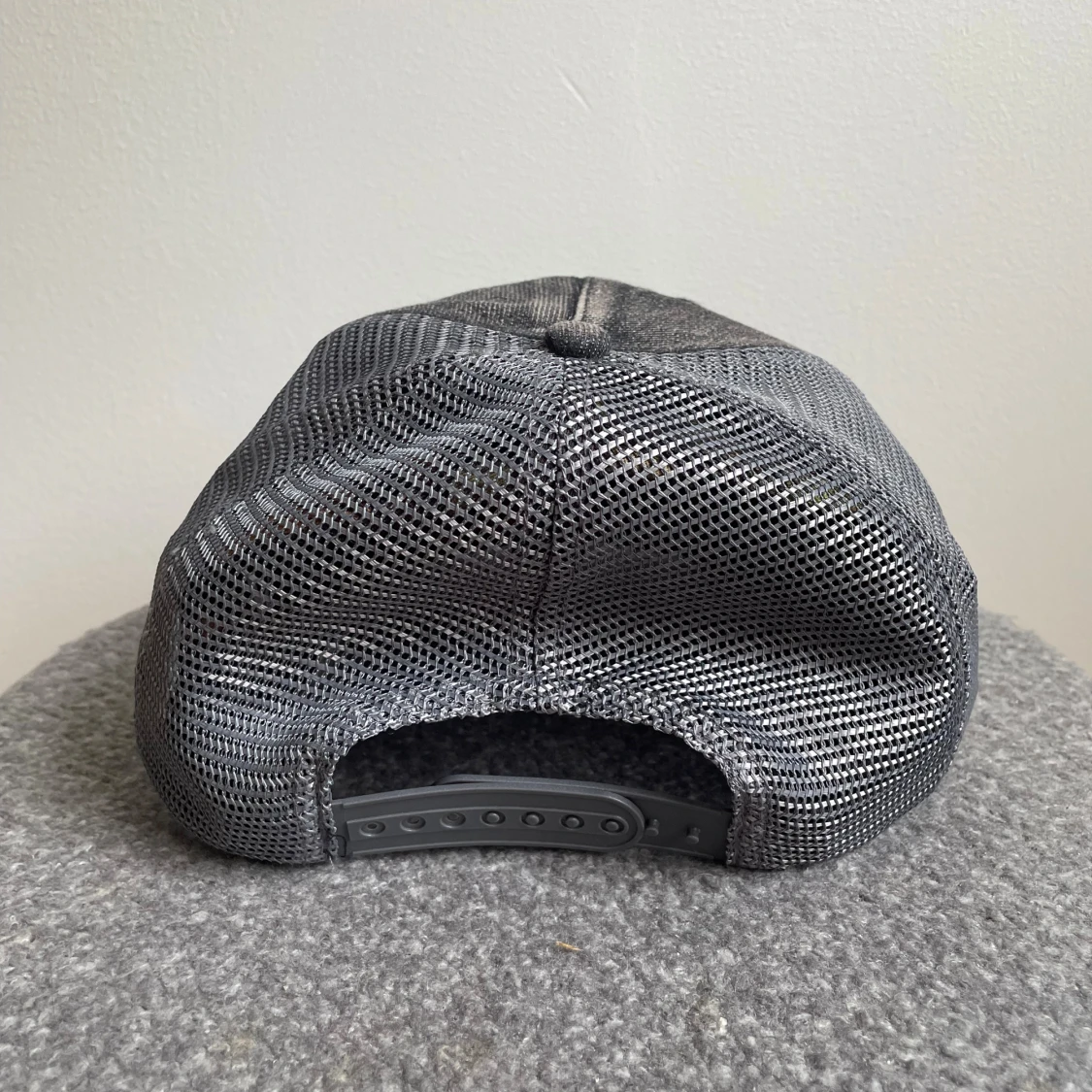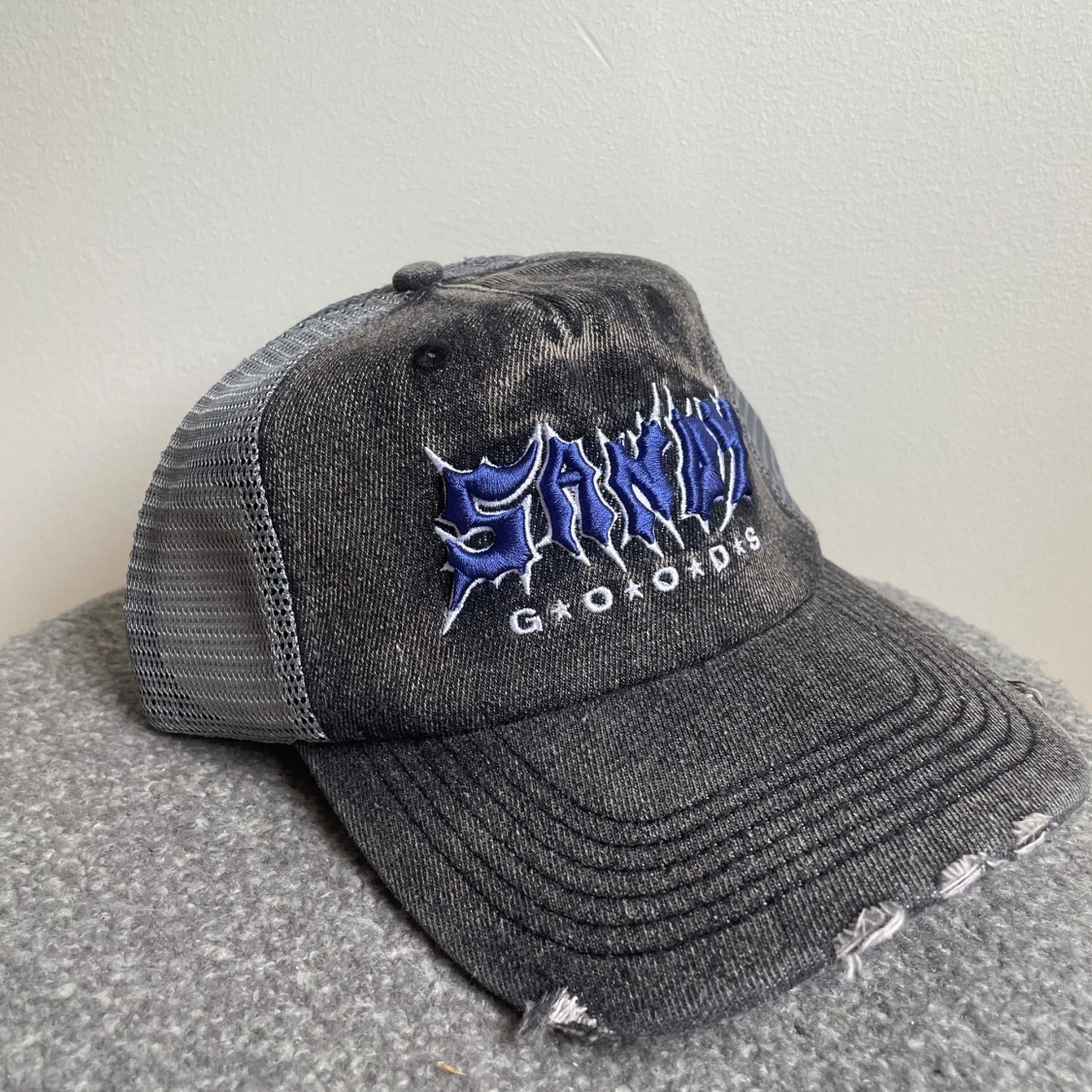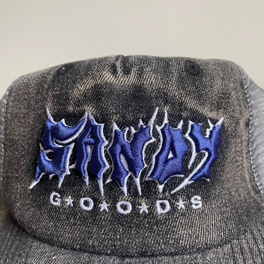Snygg urtvättad svart truckerkeps med justerbar snapback. Framtill har kepsen ett broderat lila och vitt Sandy Goods-logo. Framsidan är i denim-look med slitna detaljer på skärmen. Helt ny, aldrig använd