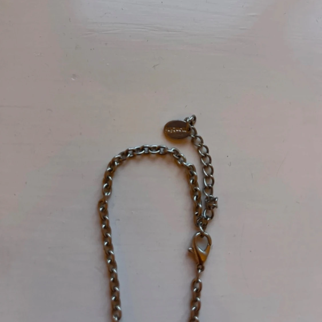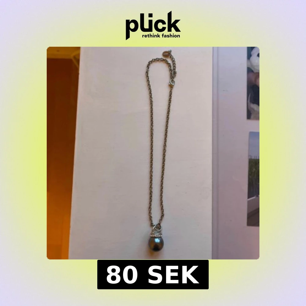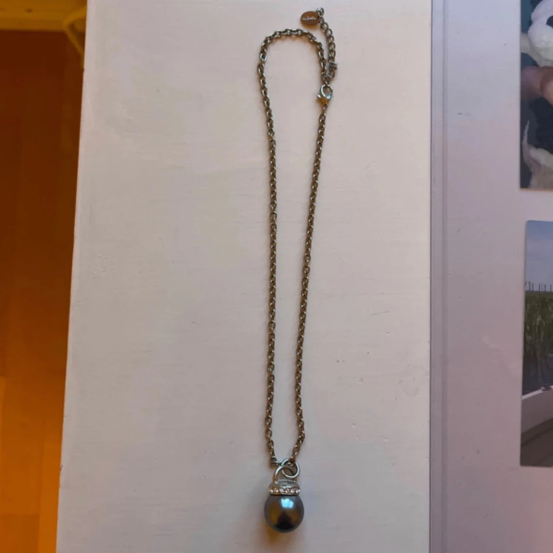 Snyggt silverfärgat halsband med en kedja och ett droppformat pärlhänge. Hänget har en rad små glittriga stenar upptill som ger extra bling. Perfekt för dig som gillar stilrena smycken med en twist.