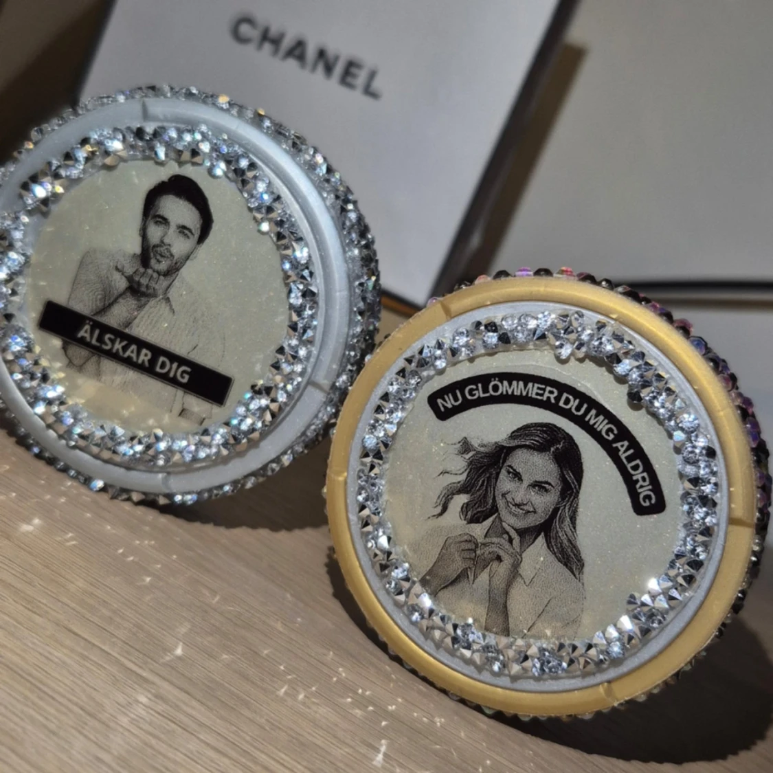 Jag designar lyxiga/glittriga snusdosor efter önskemål. Valfri logga, namn, bild & text kan tryckas på dosan.