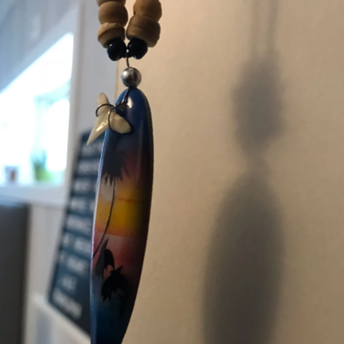 Snyggt halsband som föreställer en surfbräda med en hajtand! Reglerbart snöre. Frakt 10 kr.
