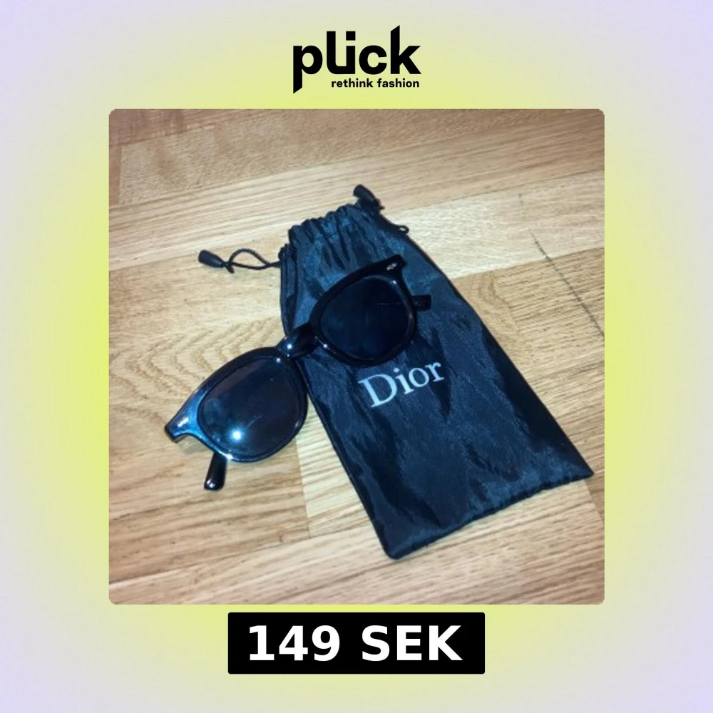 Snygga svarta solglasögon från Dior med klassisk rundad wayfarer-form. Kommer med original svart fodral med Dior-logga. Glasögonen har en stilren och tidlös look som passar perfekt till alla outfits.