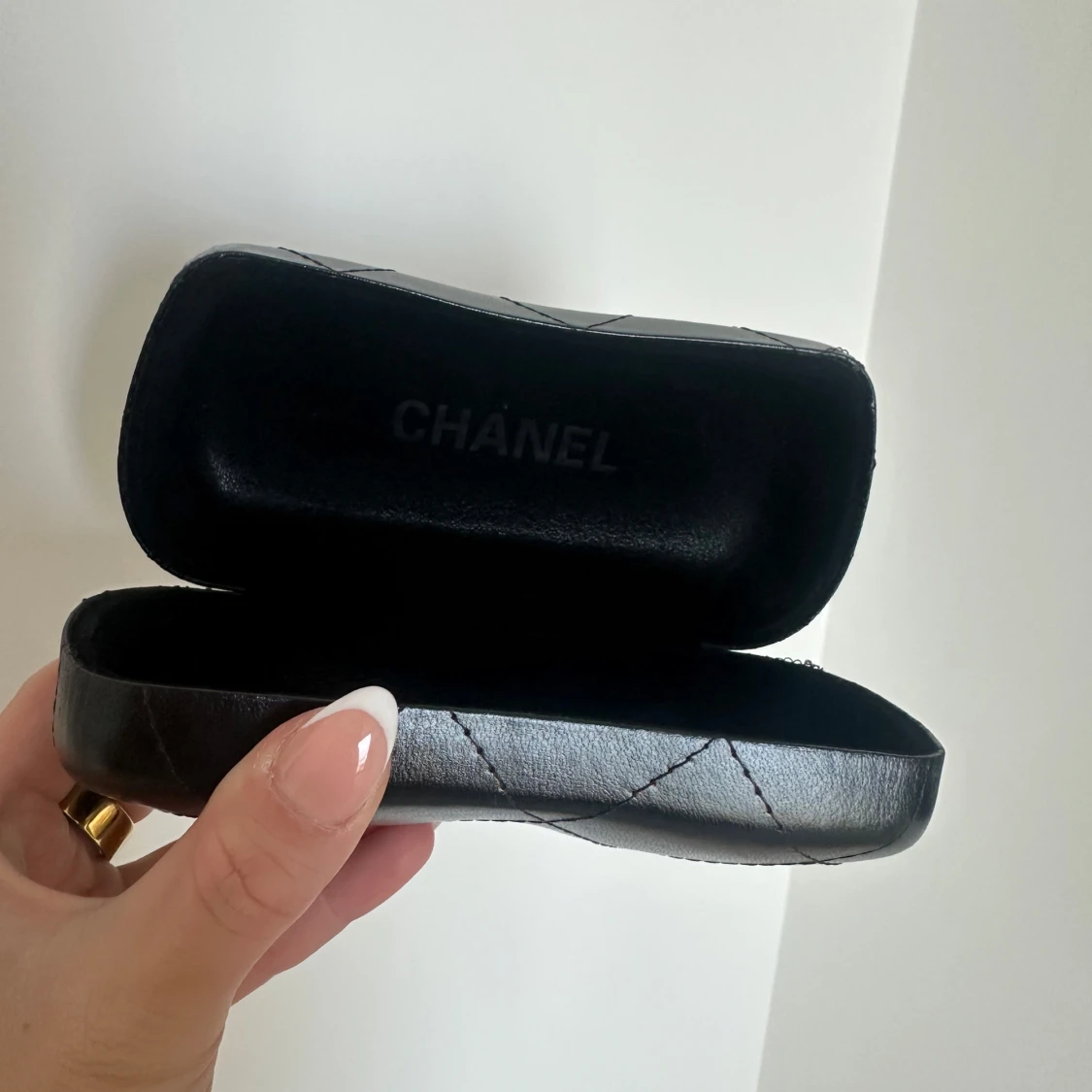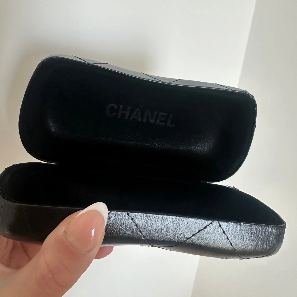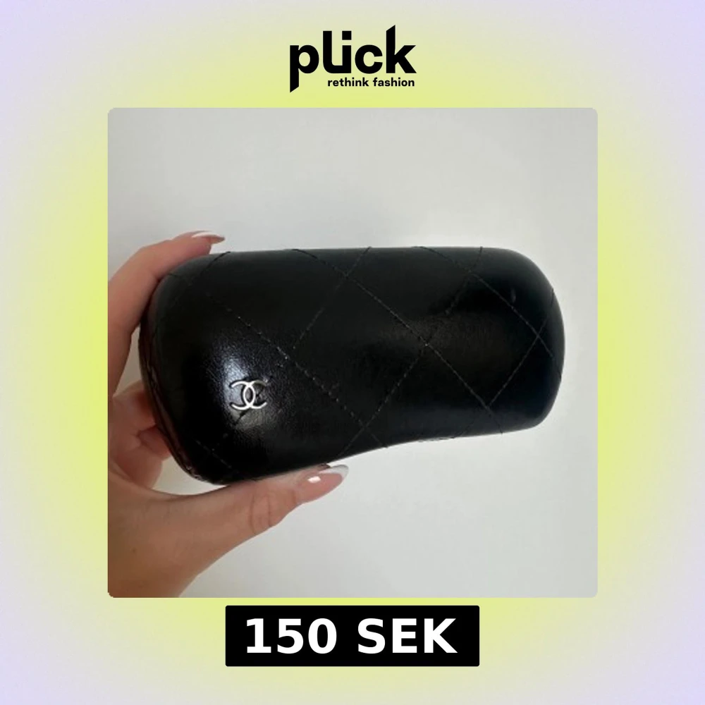 Snyggt svart glasögonfodral i quiltat skinn med silverfärgad logga på framsidan. Fodralet har en stilren och lyxig look och passar perfekt för att skydda dina glasögon.