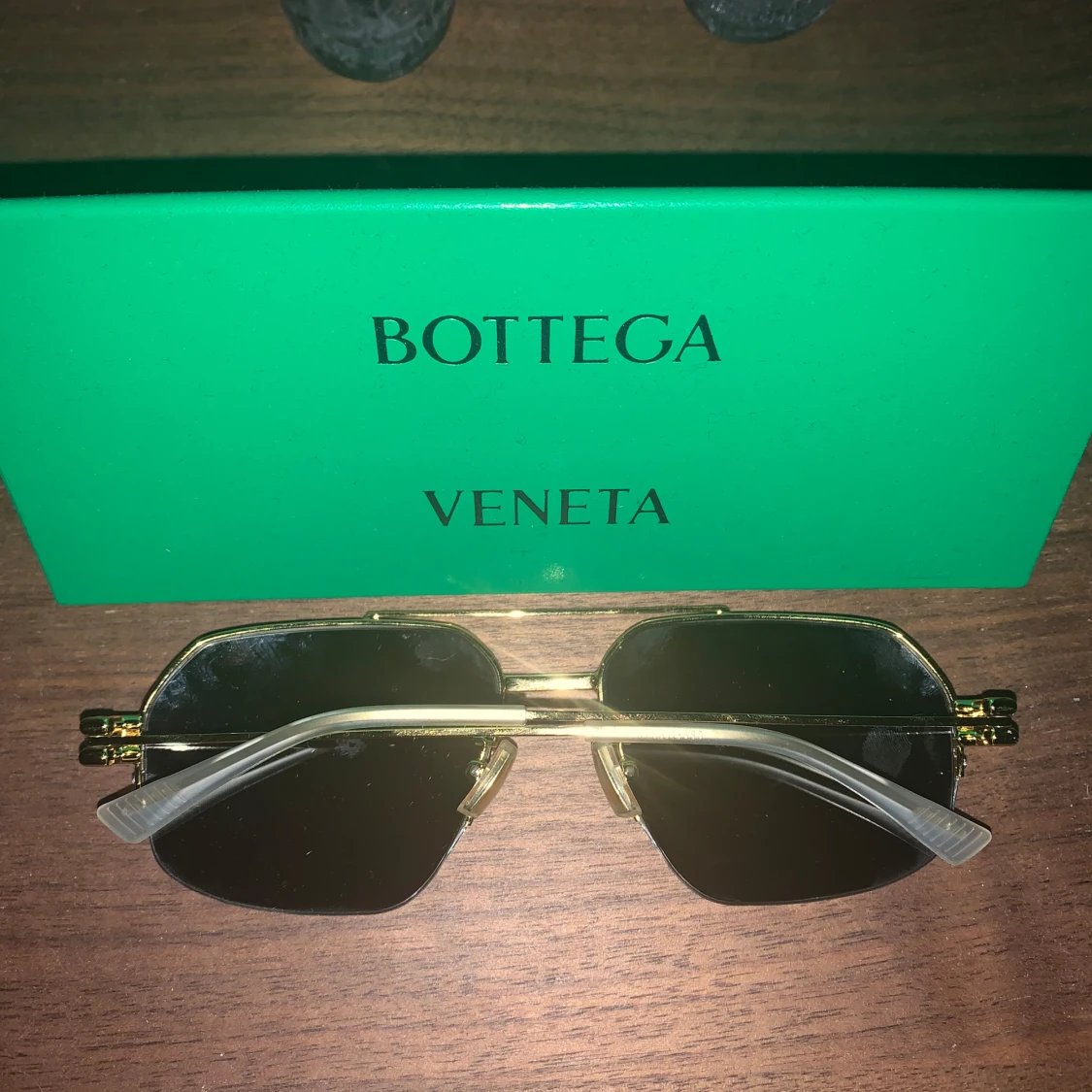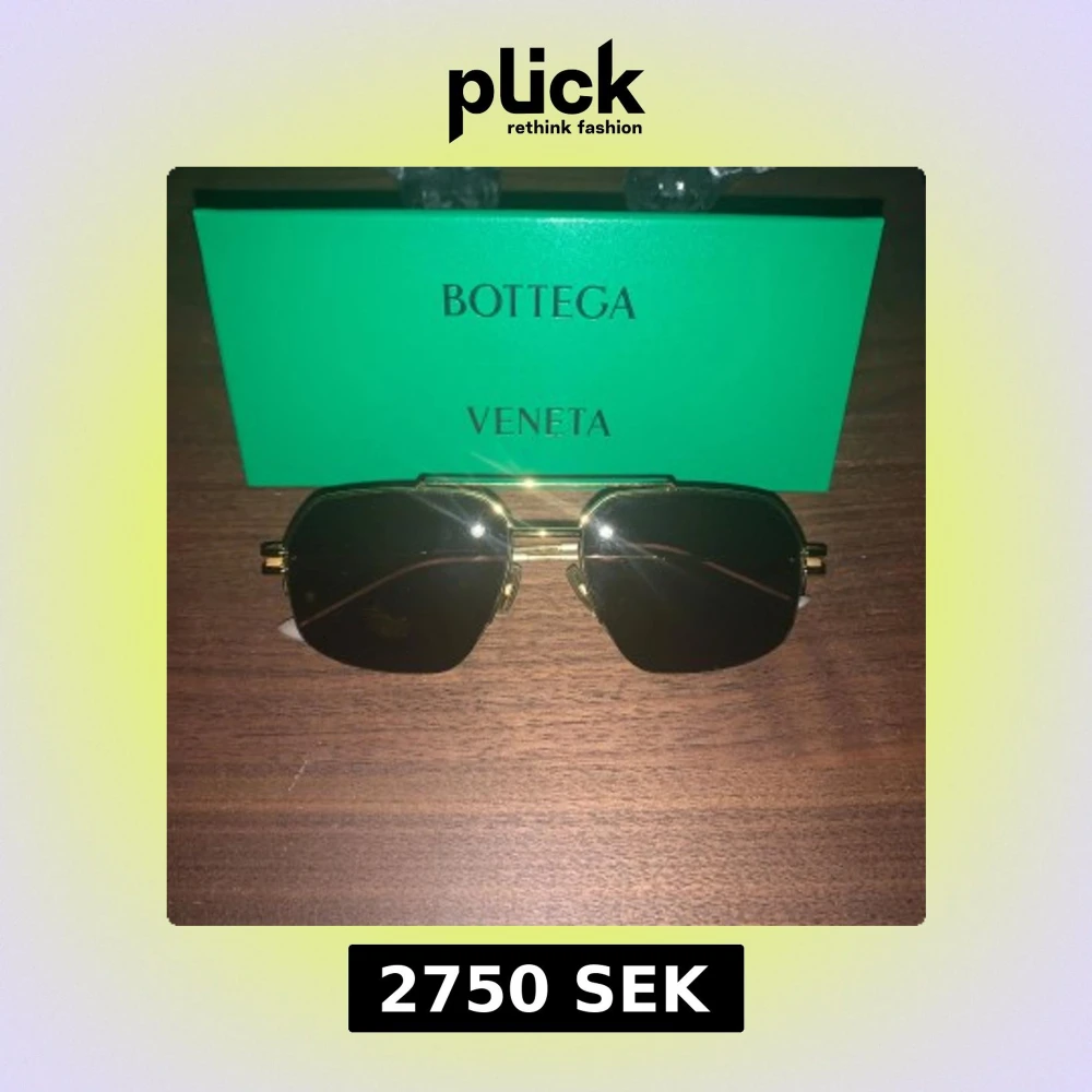 Snygga solglasögon från Bottega Veneta med en elegant guldfärgad ram. Glasen är mörka och fyrkantiga, vilket ger en stilren look. Perfekta för att höja din stil till nästa nivå. Har aldrig använt dem. Köpte dem efter sommaren men behöver pengar. KVITTO, PÅSE TILL GLASÖGONEN, BOX TILL GLASÖGONEN FINNS, BARA ATT FRÅGA!
