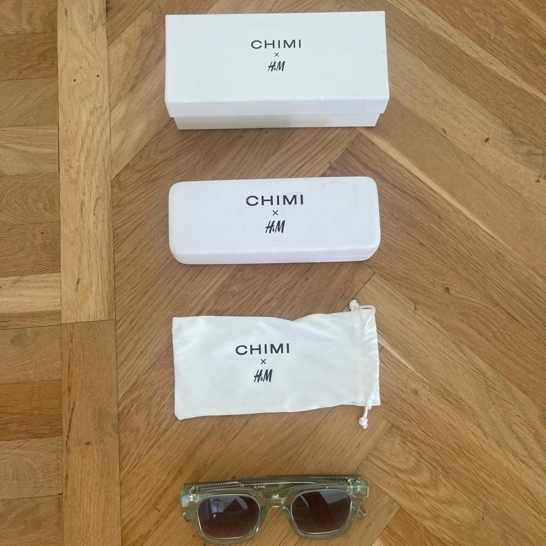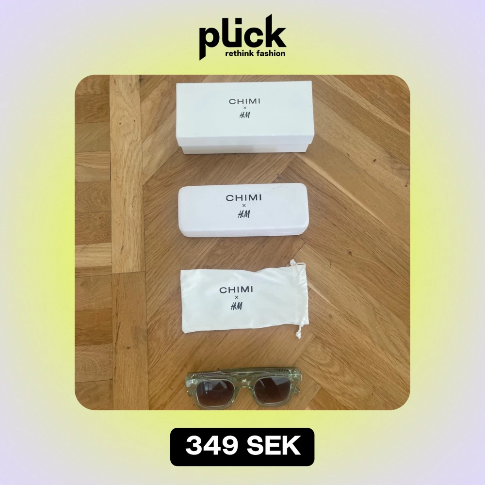 Snygga solglasögon från CHIMI x H&M i en, transparent grön färg. De har en fyrkantig form och kommer med ett matchande fodral och putsduk.