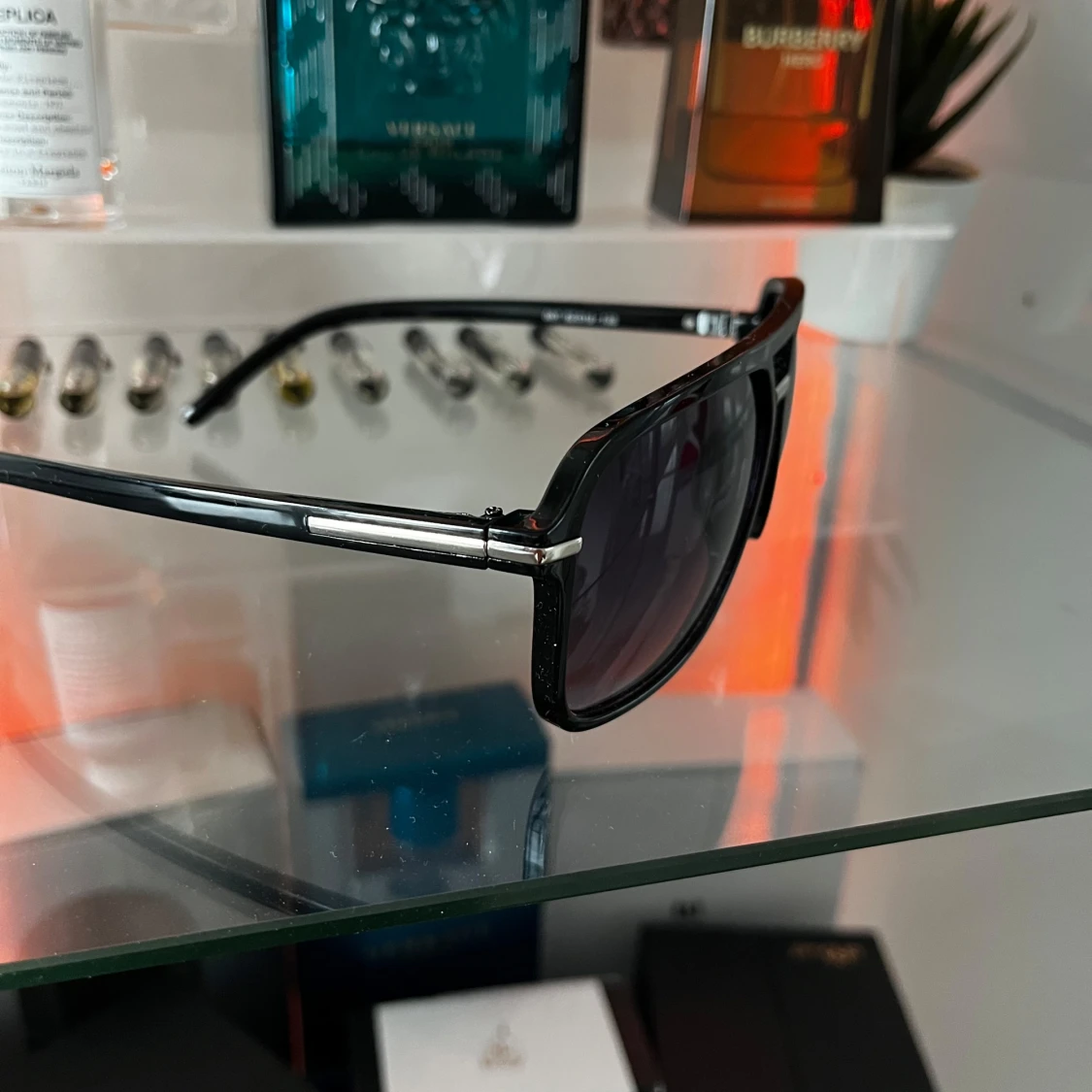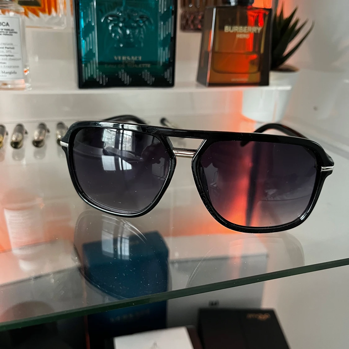 Snygga svarta solglasögon med en cool design och metallbågar. De har en klassisk aviator-stil med mörka linser som ger ett stilrent intryck. Perfekta för soliga dagar och en stilfull look.