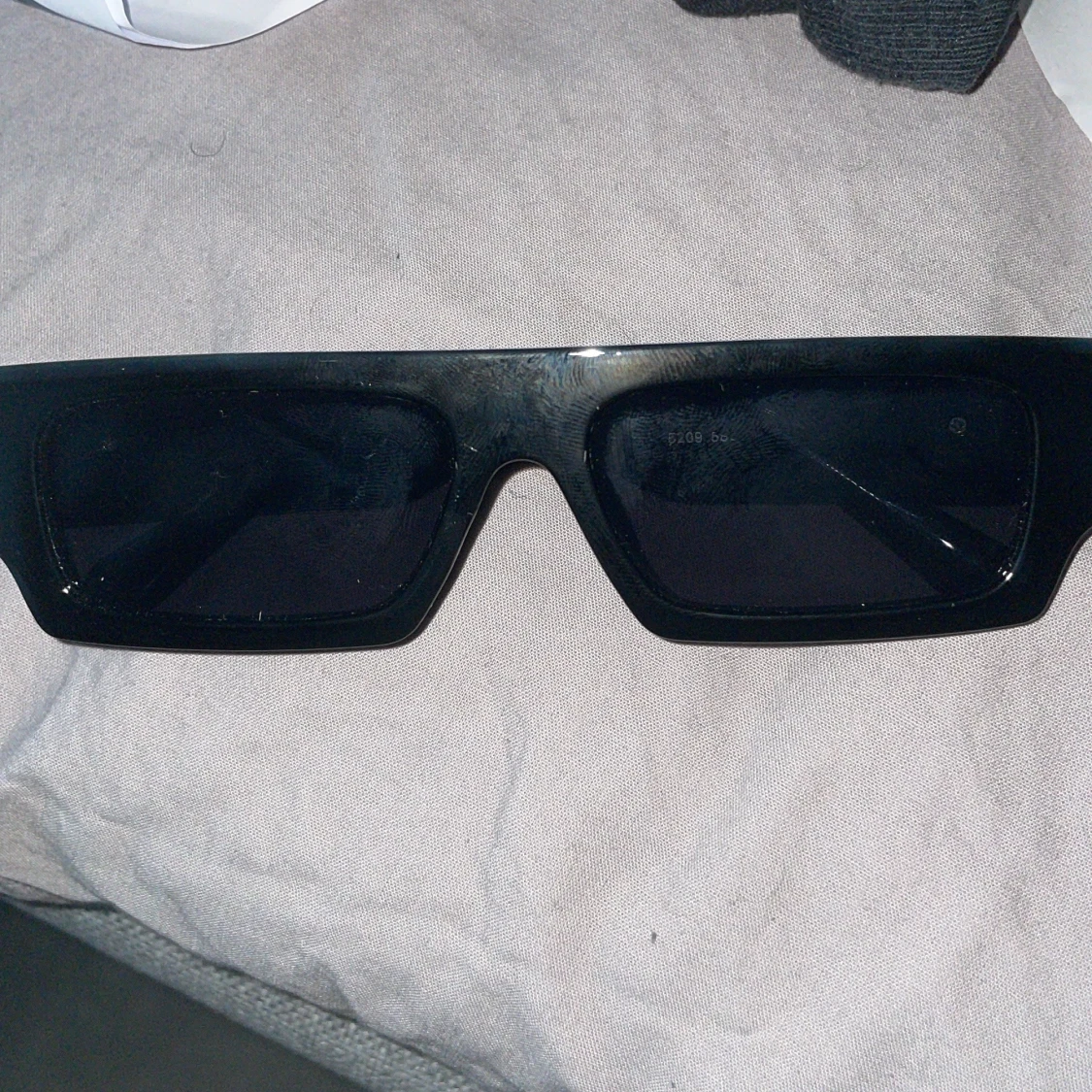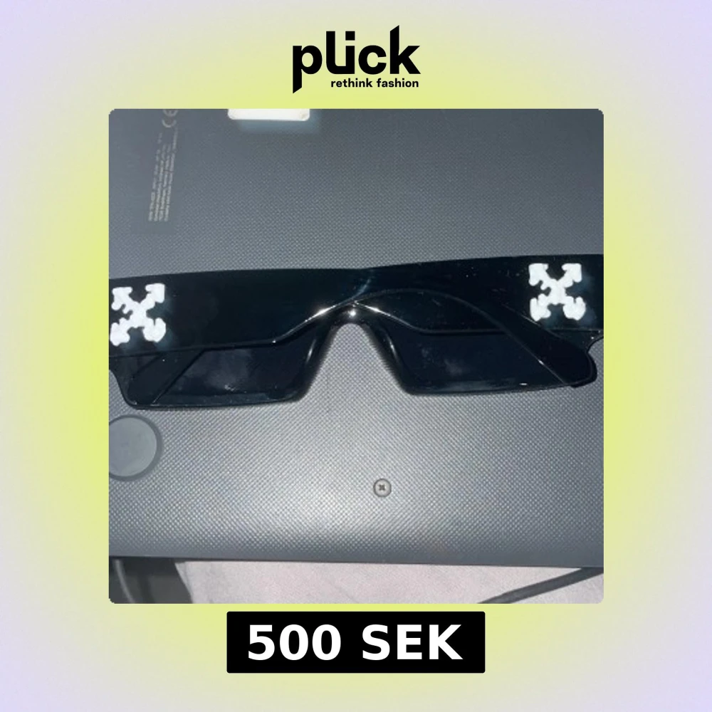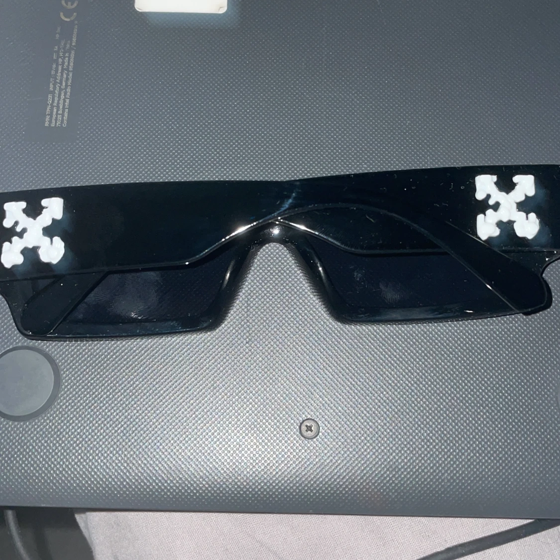 Snygga svarta solglasögon med en rektangulär form och vit logotyp på sidorna från off white Perfekta för en stilren look.