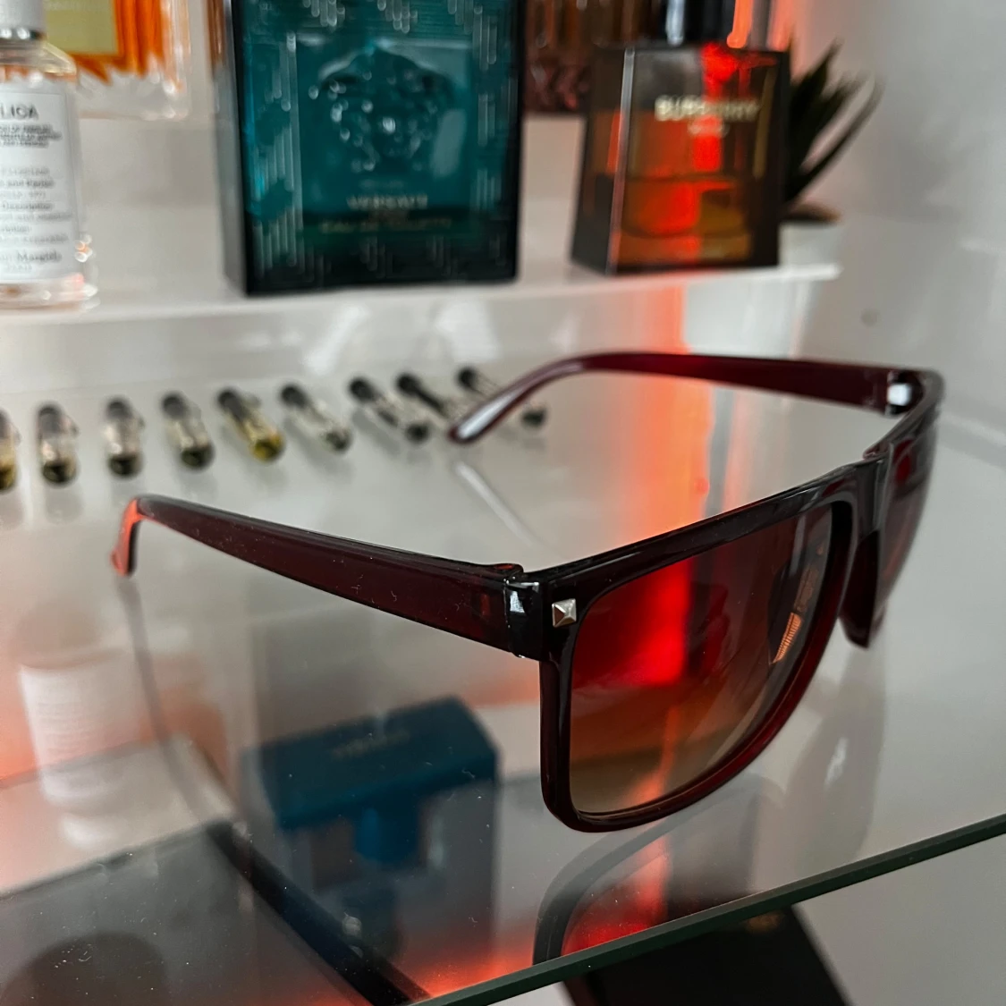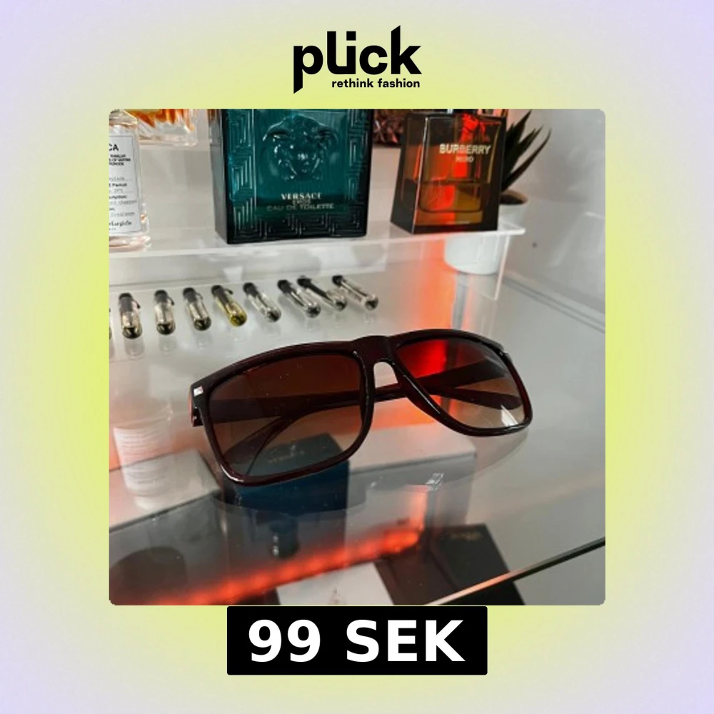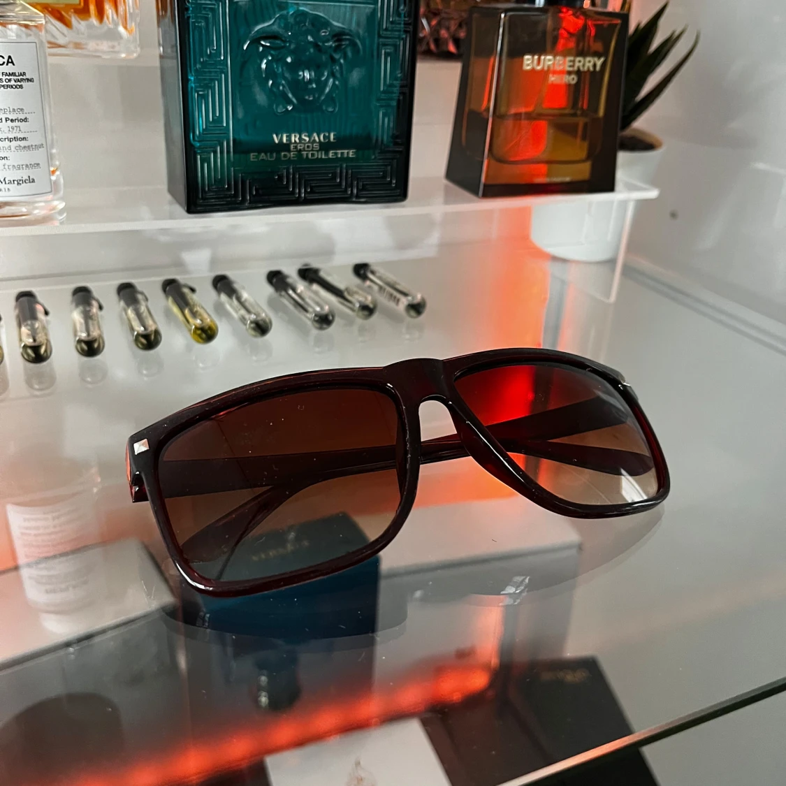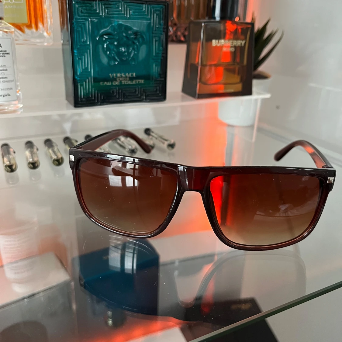 Snygga bruna solglasögon med fyrkantig form och mörka linser. Perfekta för en stilren look. Ramen har en glansig finish och små silverdetaljer vid gångjärnen.