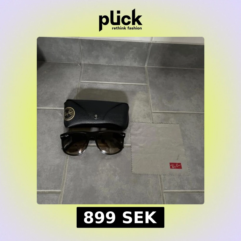 Klassiska svarta Ray-Ban boy friend solglasögon med mörka glas och ikonisk logga på bågarna. Säljes med original svart fodral i läderlook och putsduk. Hör av er vid frågor!✌️🤩