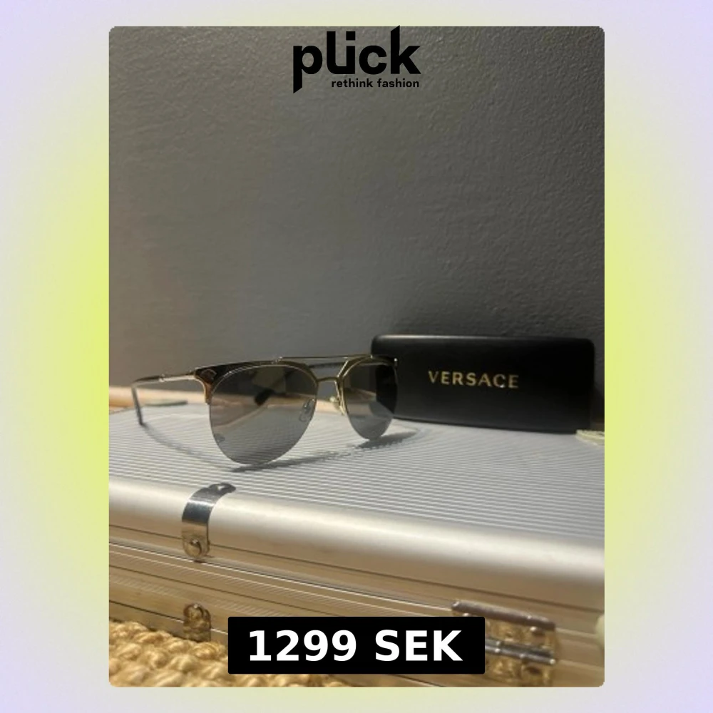 Säljer ett par riktigt snygga Versace solglasögon med guldfärgade metallbågar och svarta skalmar. Glasen är tonade i grått och har en klassisk pilotform. Medföljer originaletui med Versace-logga. Perfekt accessoar för dig som vill sticka ut.