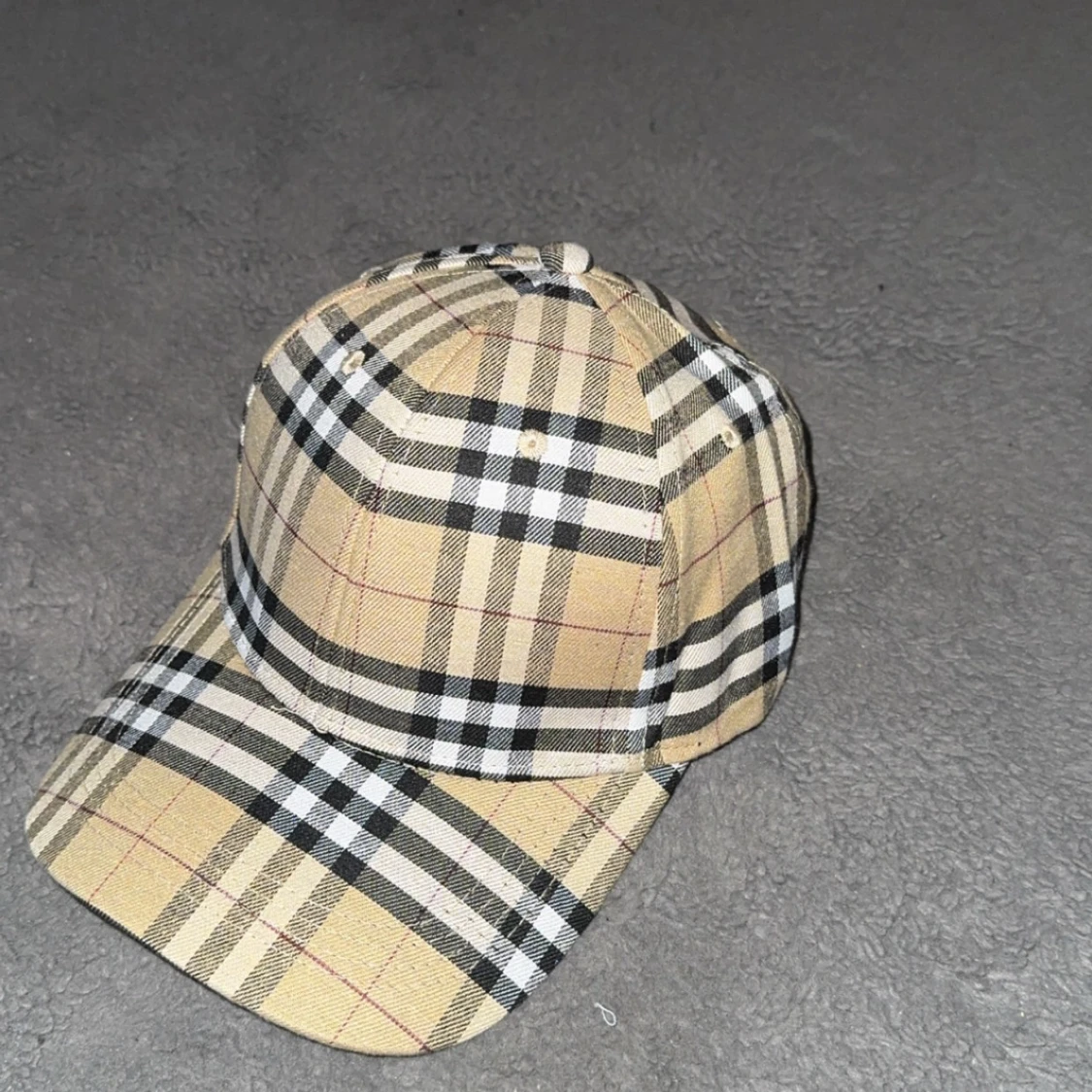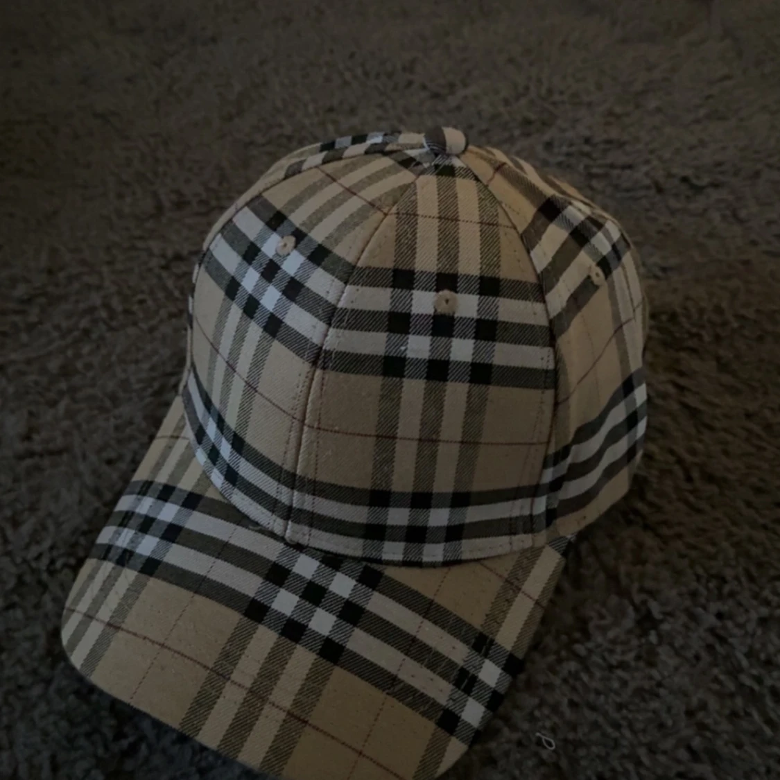 Snygg keps från Burberry i klassiskt beige rutigt mönster med svarta, vita och röda detaljer. Kepsen har böjd skärm och justerbar passform. Perfekt accessoar för att lyfta din outfit med en ikonisk touch.