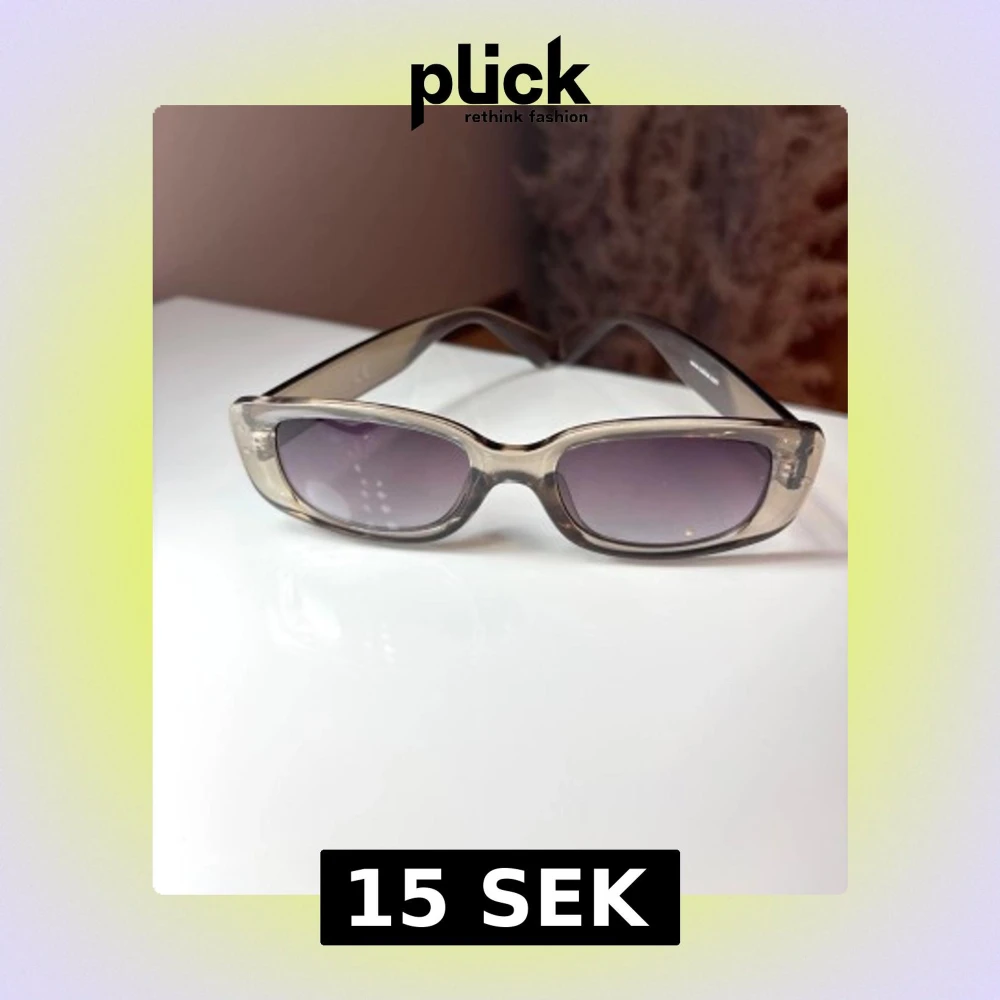 Snygga solglasögon med transparent plastbåge och rektangulär form. Glasen är tonade i grått och ger en cool vibe. Perfekt accessoar för att lyfta din stil och skydda ögonen mot solen. Det är små repor syns i bild 2. Medföljer ett fodral