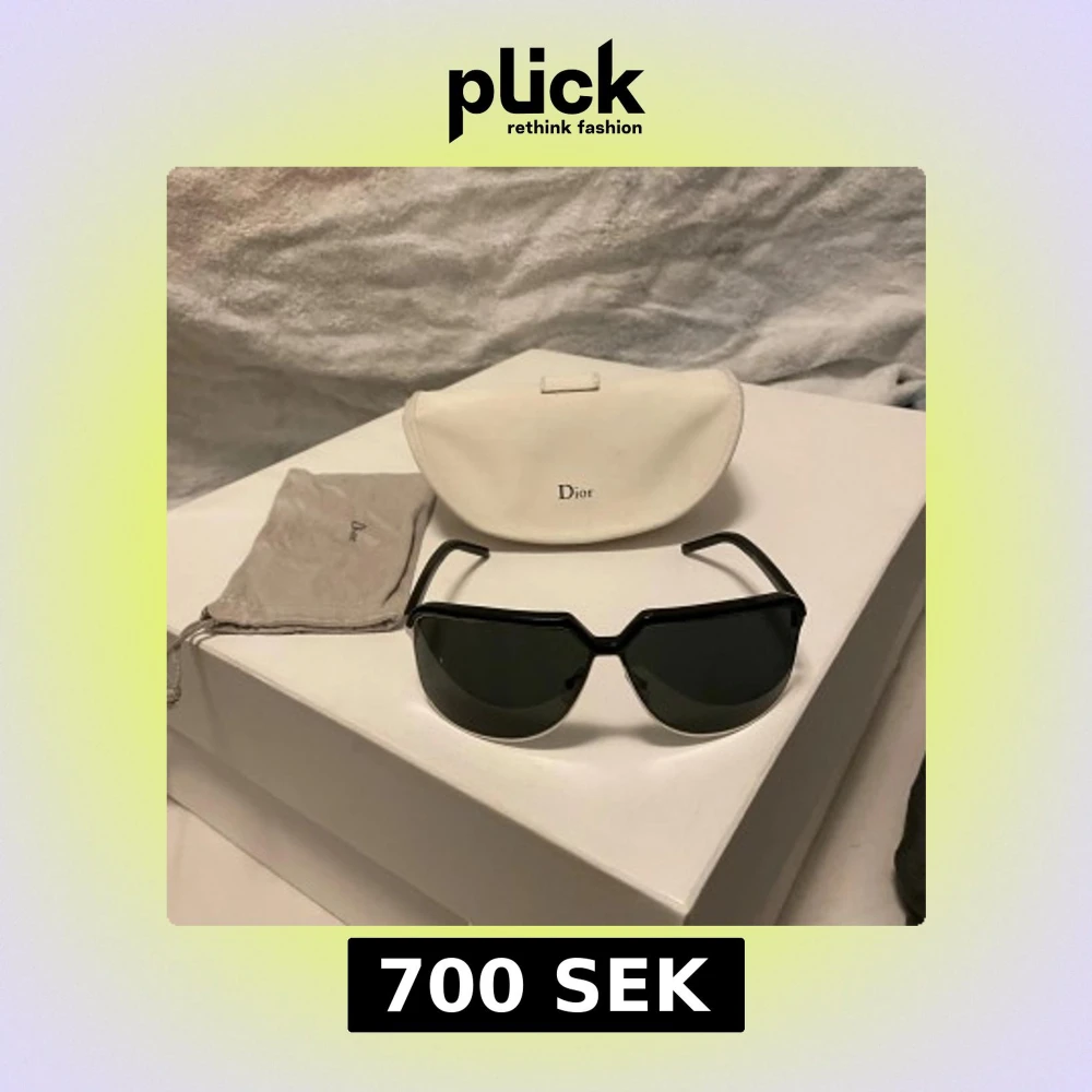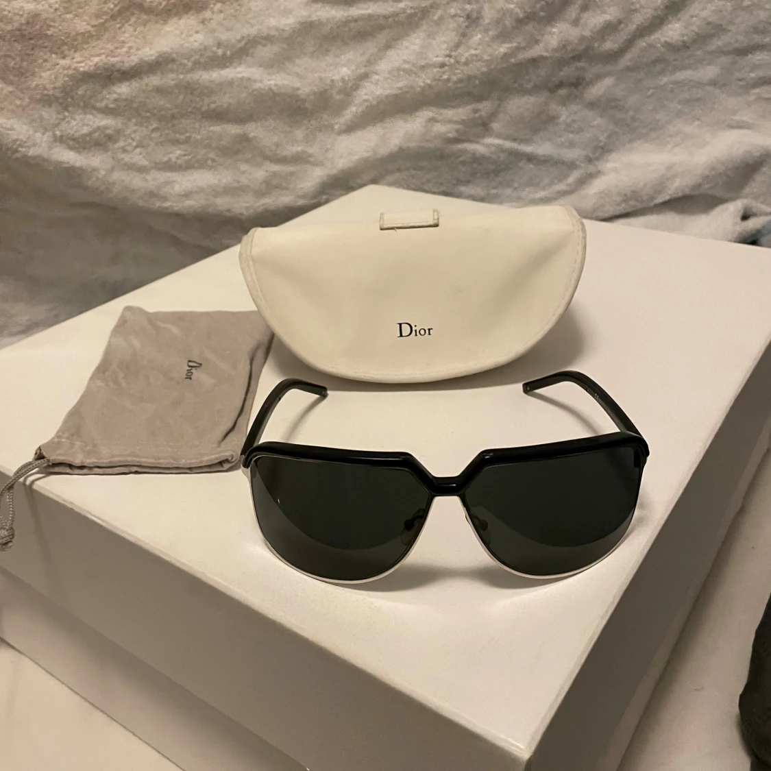 Snygga svarta solglasögon från Dior med cool, futuristisk form och mörka glas. Bågarna är i svart och har en unik design med markerad brygga. Kommer med originalfodral och tygpåse från Dior.