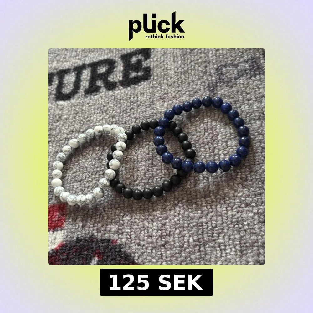 Säljer tre elastiska armband med runda pärlor: ett i vit marmorlook, ett i mattsvart och ett i djupblått. Perfekta att mixa och matcha för en cool och personlig stil. Passar både tjejer och killar som gillar stilrena accessoarer.