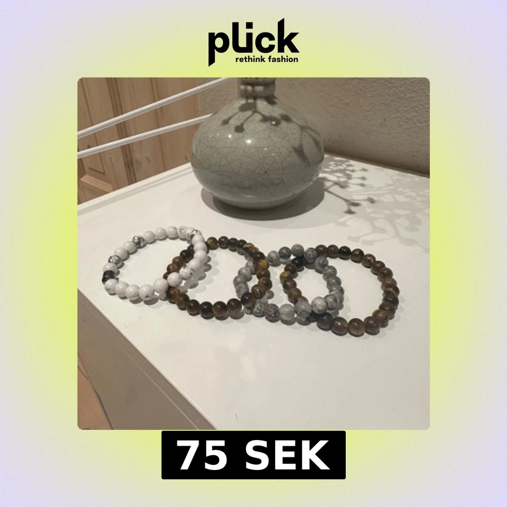 Säljer ett set av fyra stilrena armband med pärlor i olika stenar. Armbanden har en mix av vita, grå och bruna nyanser, vilket ger en naturlig och jordnära känsla. Perfekt för att komplettera din outfit med en touch av elegans.