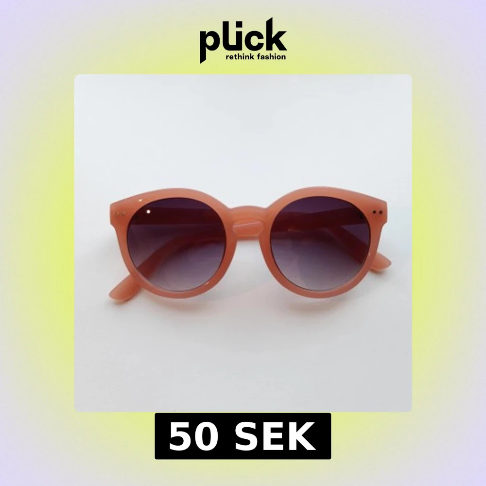 Snygga runda solglasögon med rosa båge och mörka linser. Är ganska små i storlek och ena skalmen (alltså "armen") på glasögonen är något mer böjd än den andra, men det går nog att justera. Pris kan alltid diskuteras.