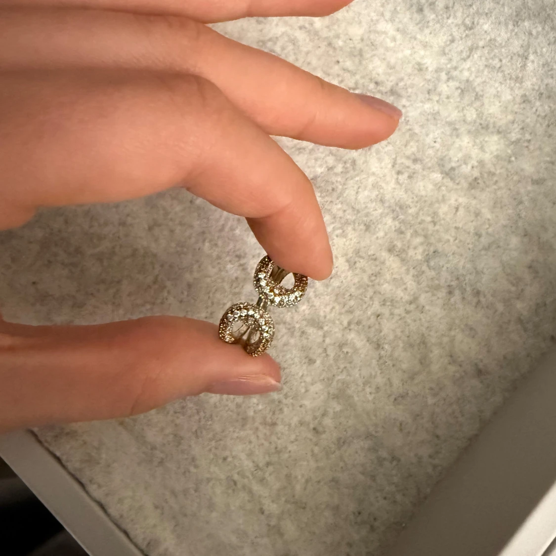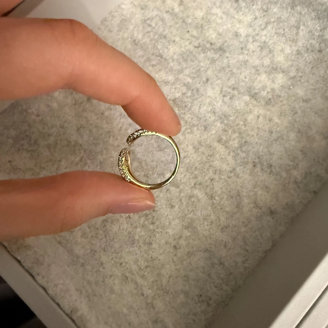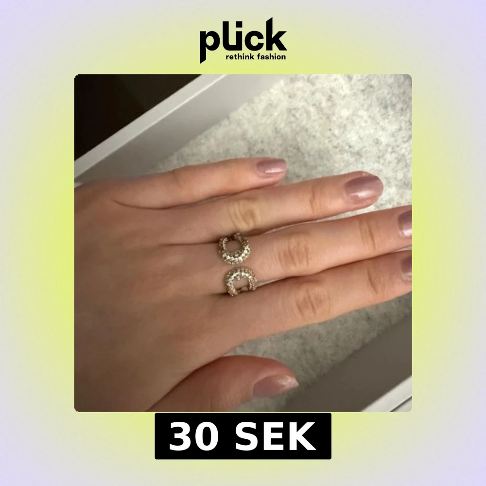Trendig guldfärgad ring med två öppna cirklar dekorerade med små glittrande stenar. Snygg och unik design som sticker ut på handen. Går att justera efter din egna storlek