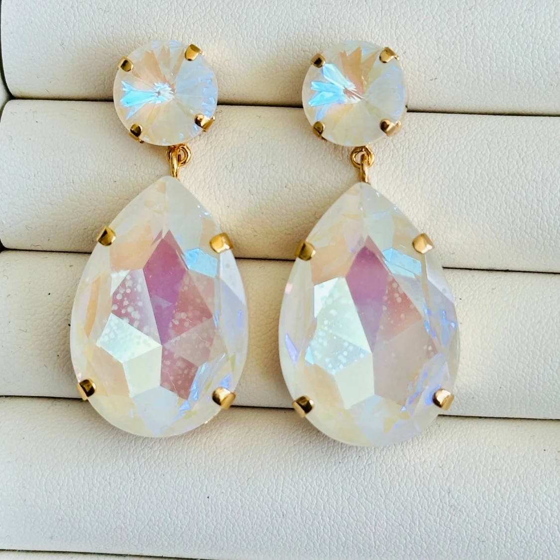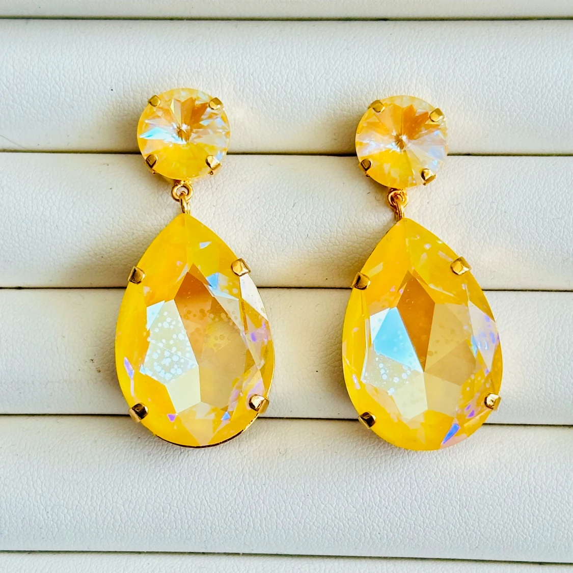 4.a par statement-örhängen med stora droppformade kristaller i gult, blått, turkos och klar kristall av märket Crystalinda. Gjorda av äkta Swarovski kristall och mässing med 18 karats guldplätering. Perfekta för att ge en färgklick till din look! Örhängena är oanvända och säljs i originalask. Tillhörande ringar finns vid intresse. 💎650kr/st eller 2500kr för alla. Pris på marknad för liknande: 1495kr/st. Gold plated jewelry with carefully selected crystals of highest quality. Handmade.