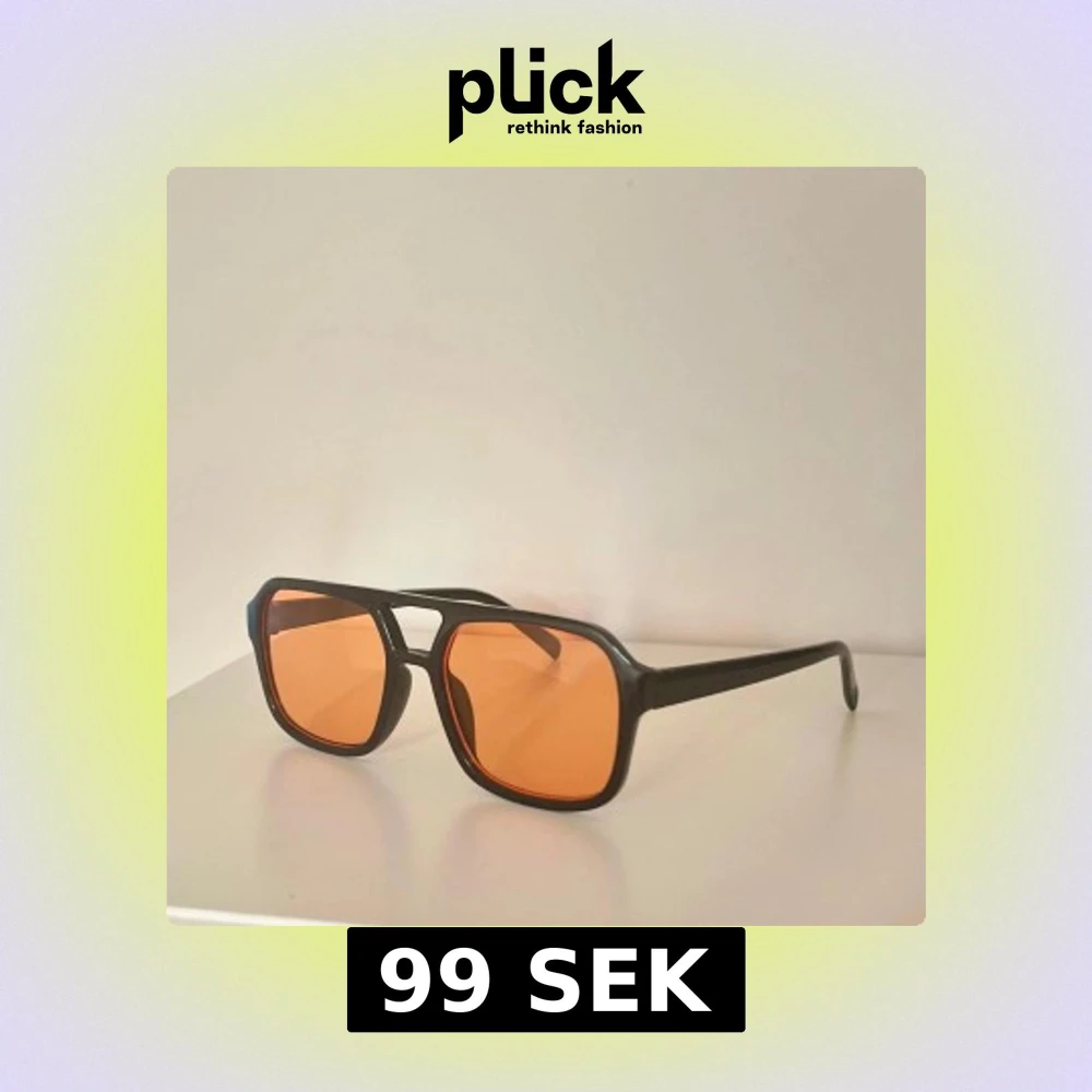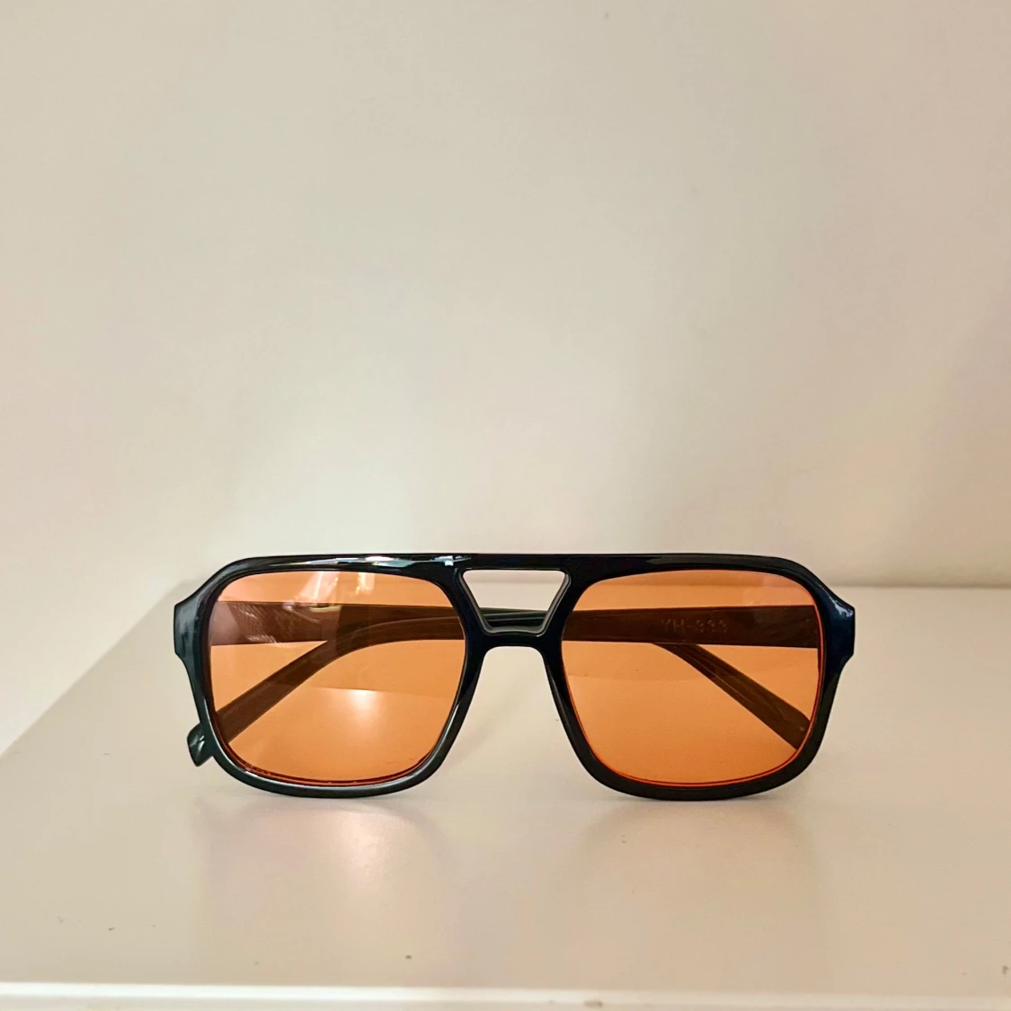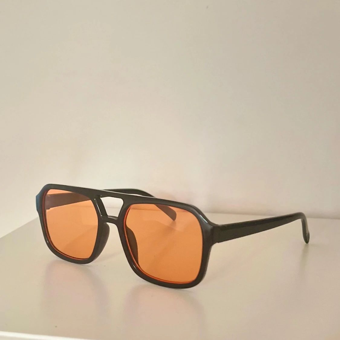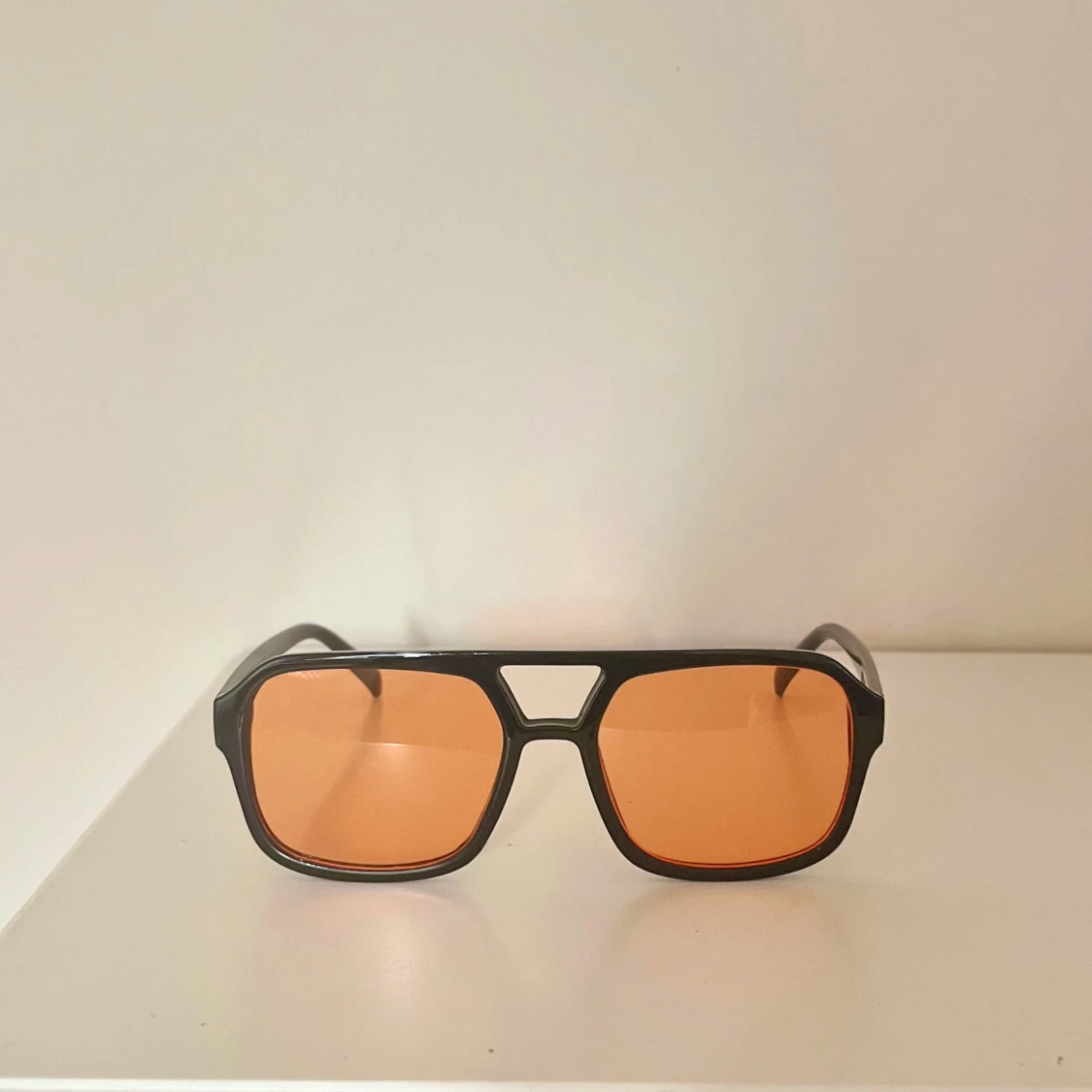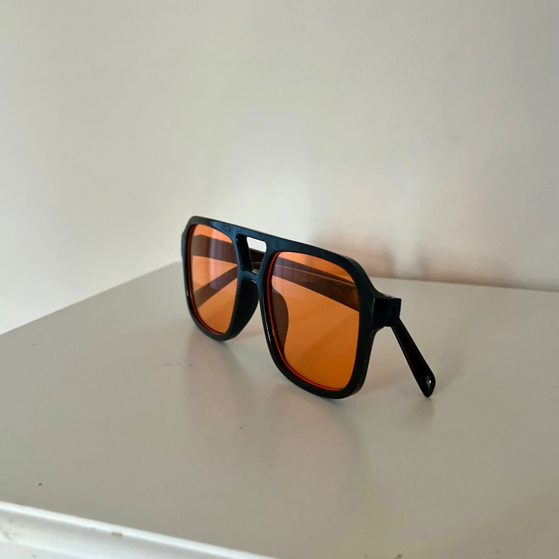 Snygga solglasögon med svart, kantig båge och stora fyrkantiga orangefärgade glas. Perfekt accessoar för att sticka ut och ge en cool retrovibe till din stil🤵🏼
