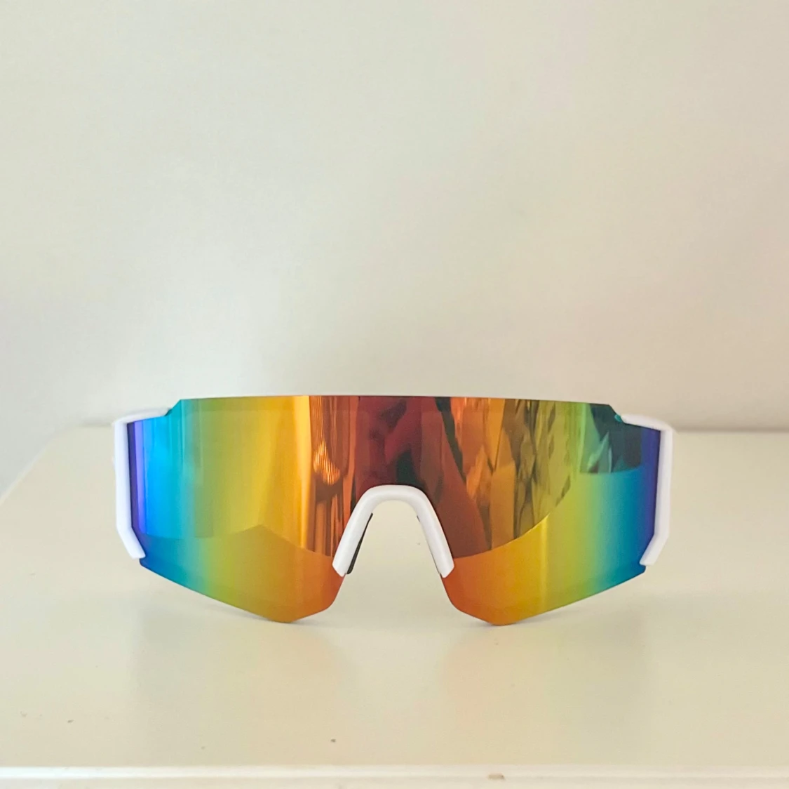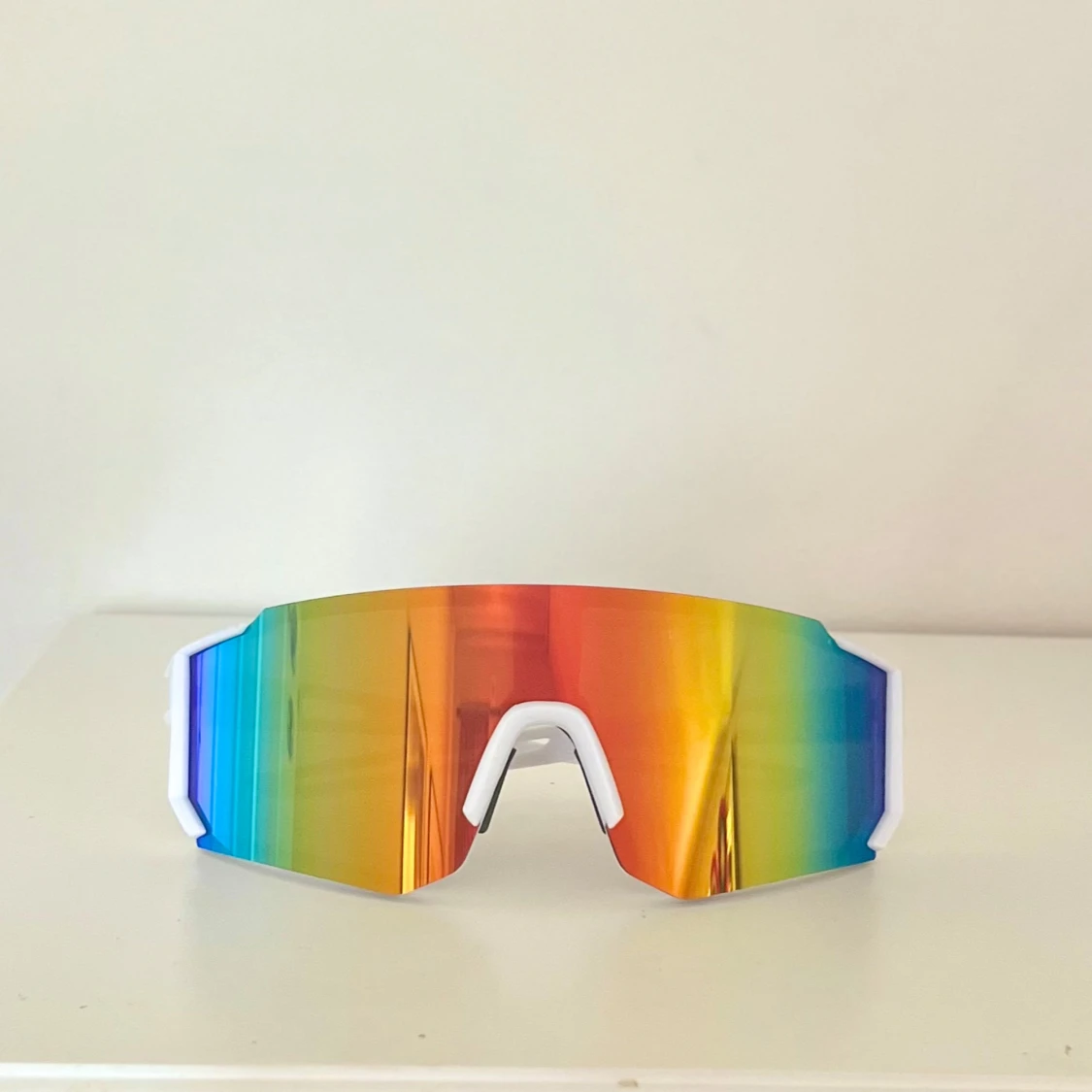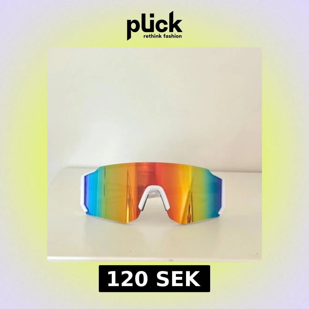 Säljer ett par sportiga solglasögon med vita bågar och stora, regnbågsfärgade spegelglas. Glasögonen har en modern, kantig form och passar perfekt för träning utomhus☀️ Snygg och futuristisk look🔥