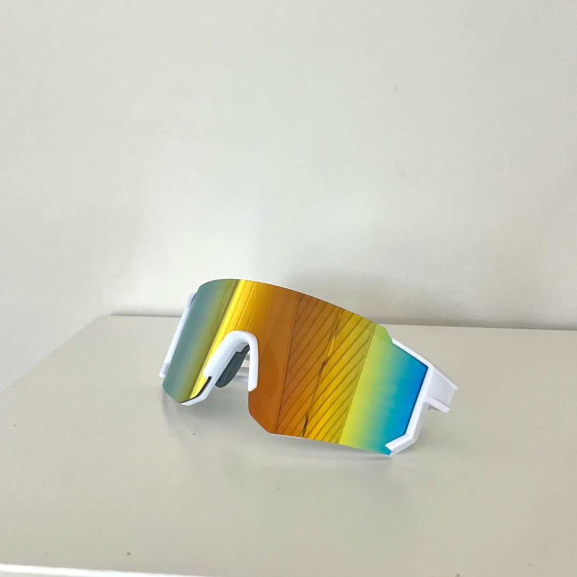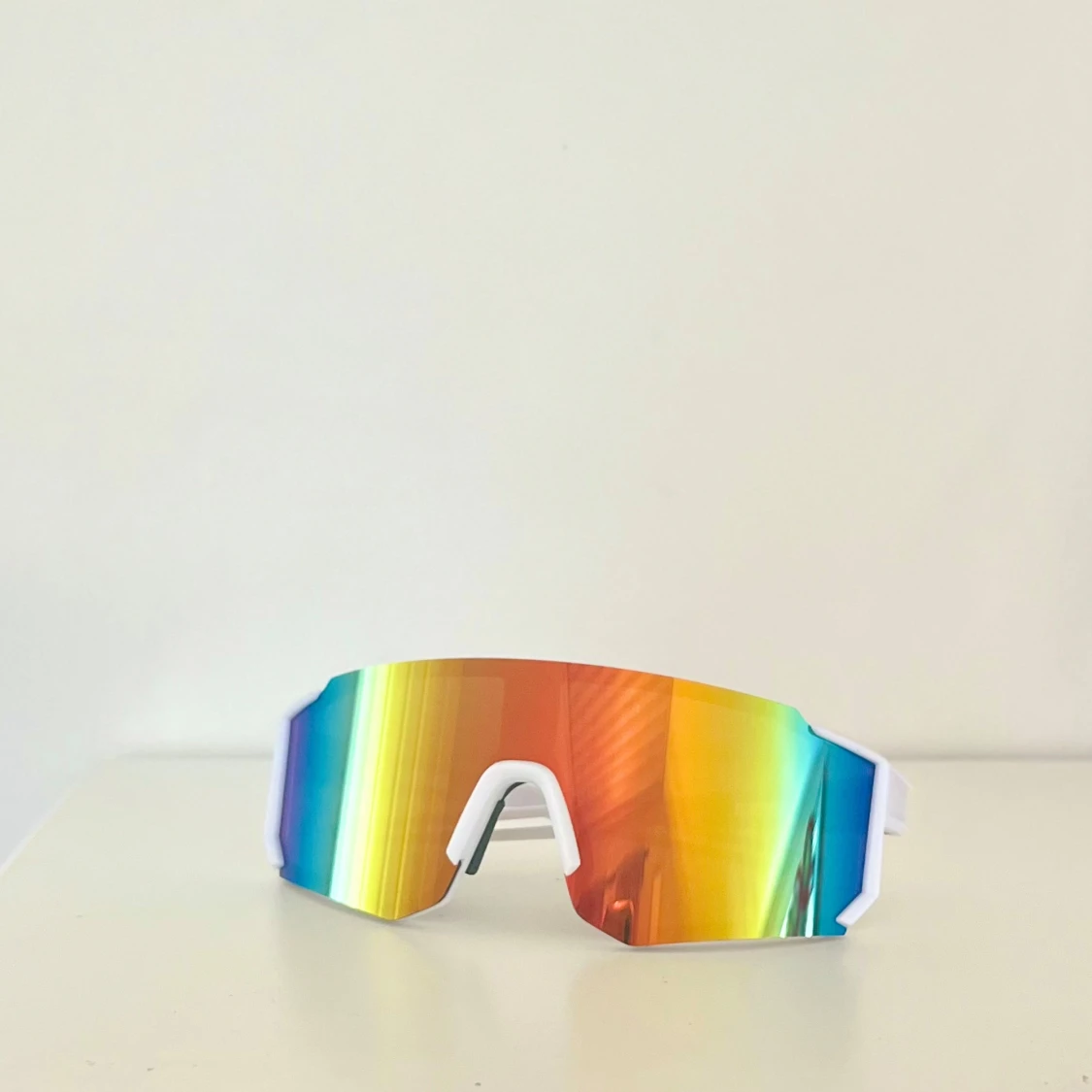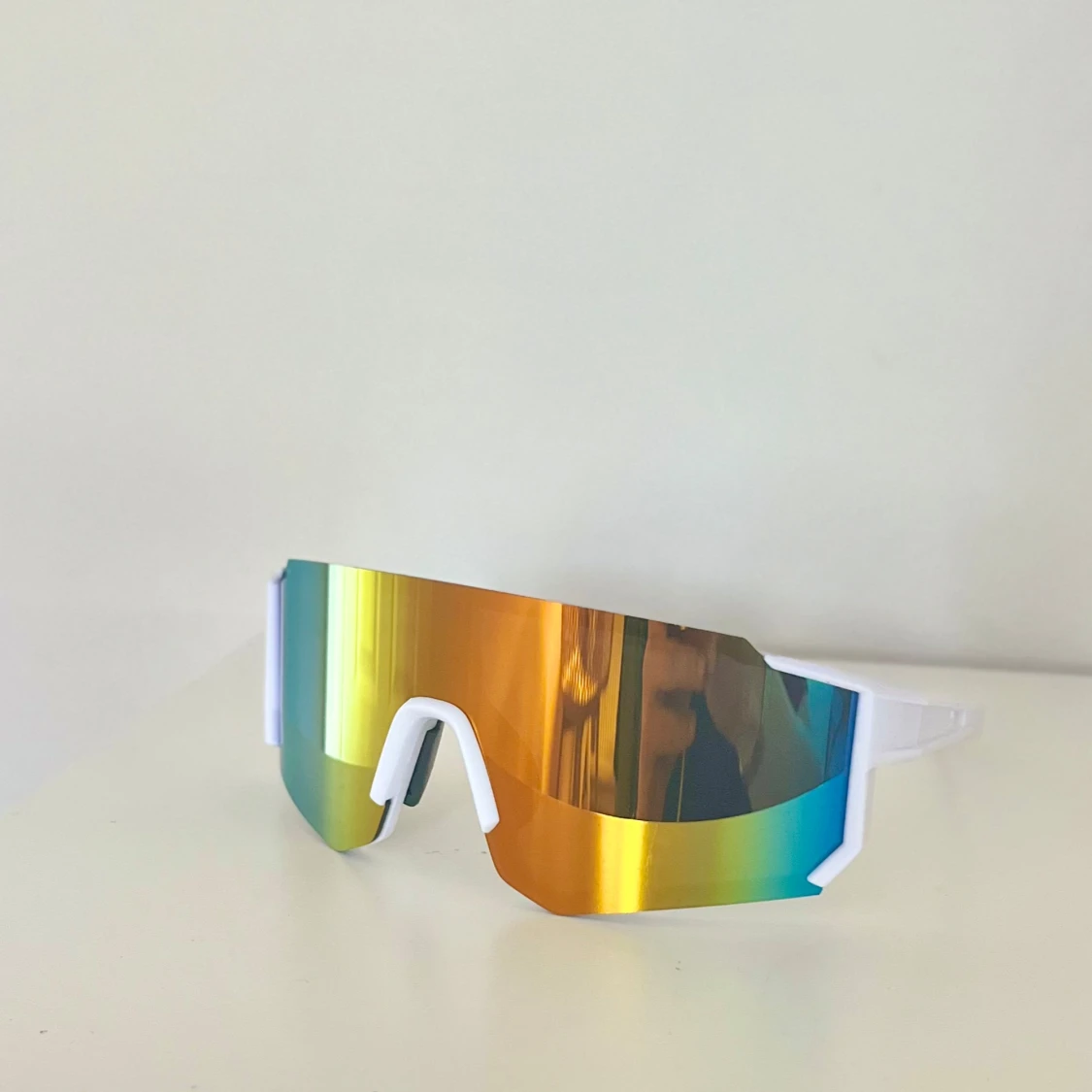 Säljer ett par sportiga solglasögon med vita bågar och stora, regnbågsfärgade spegelglas. Glasögonen har en modern, kantig form och passar perfekt för träning utomhus☀️ Snygg och futuristisk look🔥