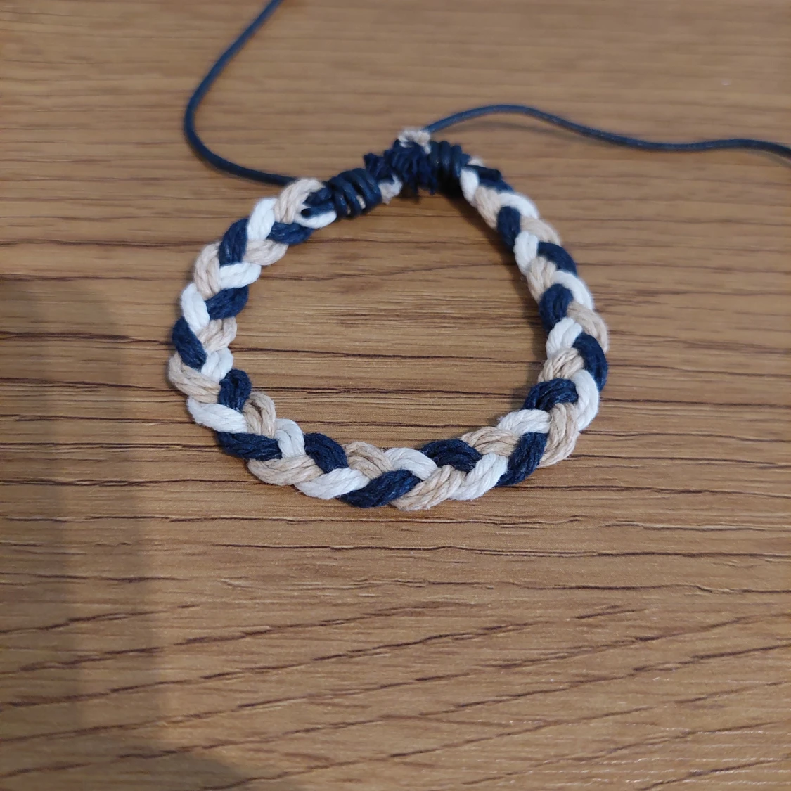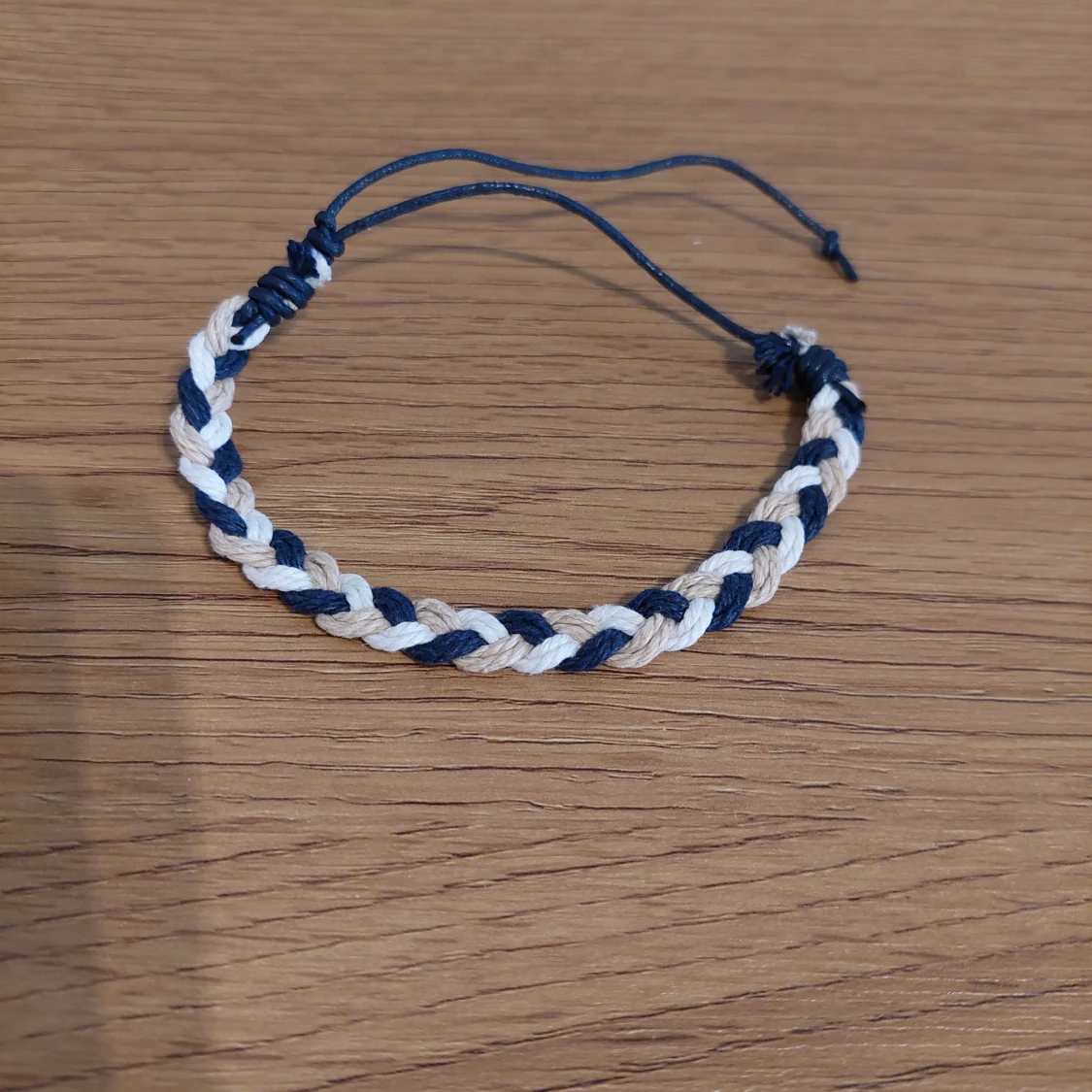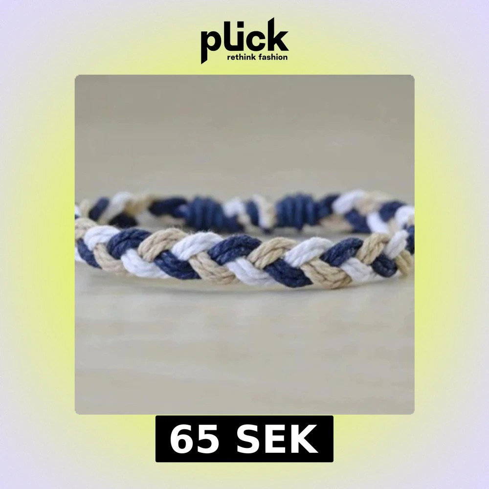 Snyggt flätat armband i beige och blått. Perfekt accessoar för en avslappnad stil. Justerbar storlek med knytband för att passa de flesta handleder.