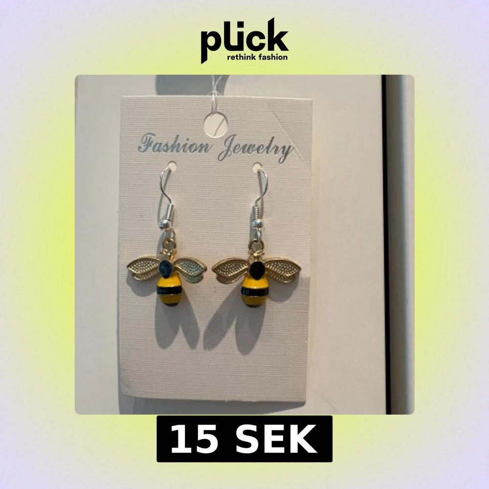 Unika örhängen formade som bin med gul och svart randigt mönster. Vingarna är i guldton med detaljerad struktur och kroppen har glansig finish. Perfekt för dig som vill sticka ut med ett lekfullt smycke.