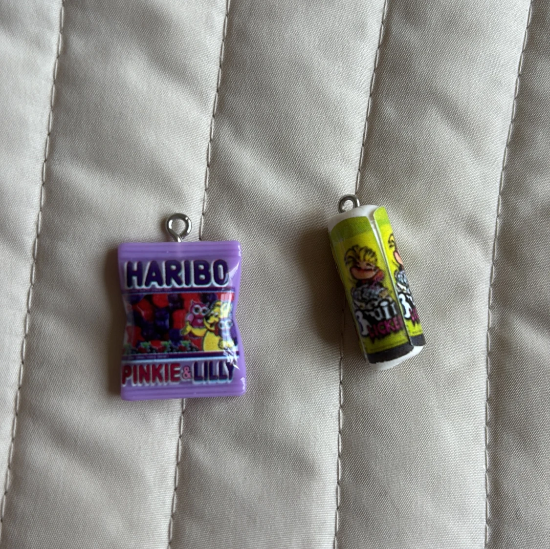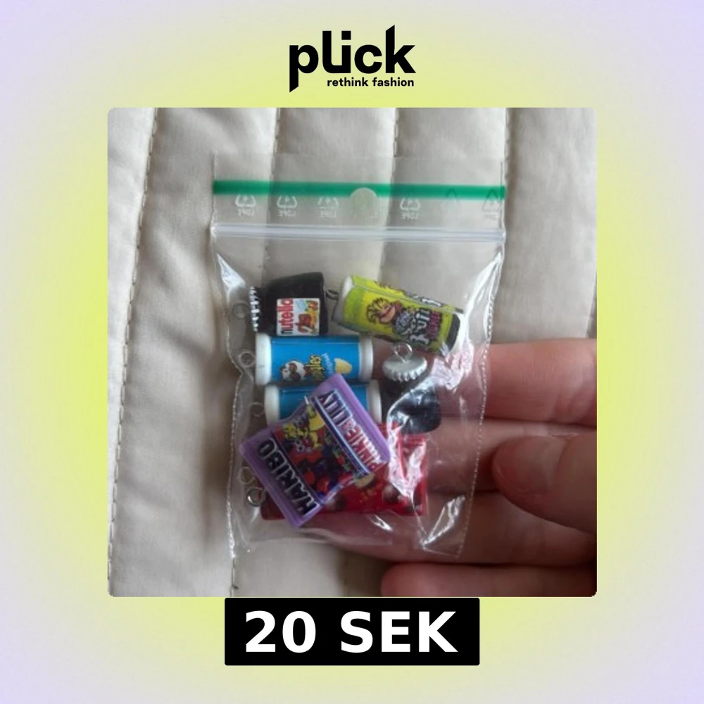 Samling med 8 färgglada berlocker som ser ut som godisförpackningar: Nutella, Maltesers, Pringles, Haribo och Sour Pickle. Perfekta att använda till armband, halsband eller örhängen. Mix av röd, blå, gul, lila och svart, med roliga detaljer och metallöglor för enkel montering.