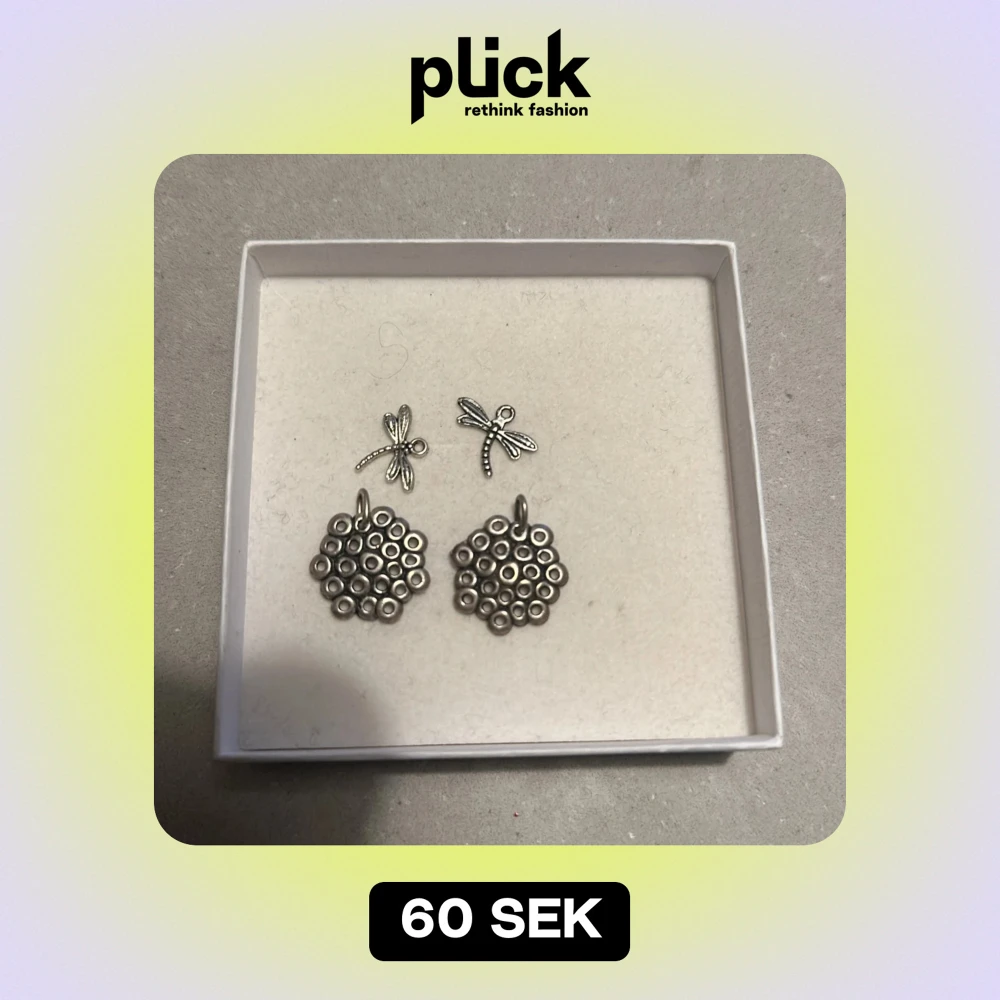Två par örhängen i silver. Ett par med små trollsländor och ett par med bikakeformade hängen. Perfekta för att ge en unik touch till din outfit. Passar både till vardag och fest! Hänge fattas