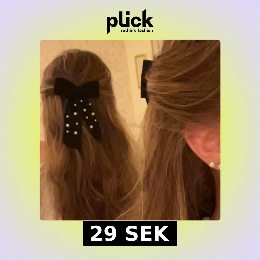 Gullig svart rosett till håret med pärldetaljer, fäst med metallspänne. Rosetten är gjord i ett tunt, tyg och dekorerad med vita pärlor i olika storlekar. Jätte söt o gullig men kommer inte till användning. Har mycket tjockt hår o så som jag har på bilden håller den hela dagen.✨väldigt tunt tyg så de är dubbel tyg på den (de är därför de ser ut som lite vit fläckar på bilden såg jag men de är de inte i verkligheten