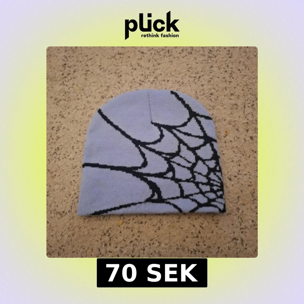 Ljusblå beanie med svart spindelnätsmönster. Tillverkad i mjuk och stretchig akryl, perfekt för att hålla värmen under kyliga dagar. Snygg och unik design som sticker ut i mängden. Knappt använd.