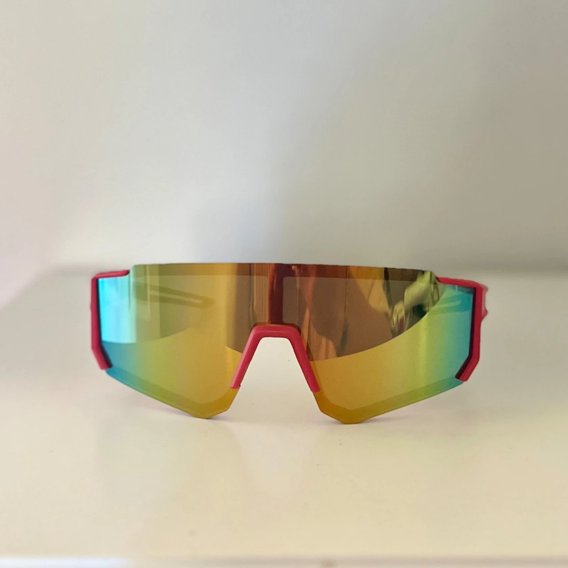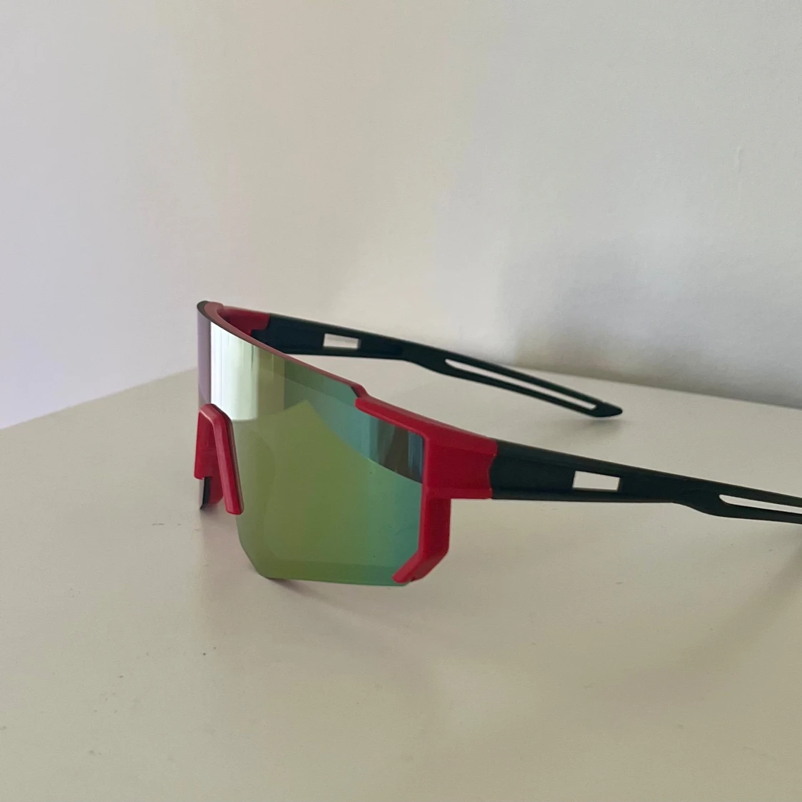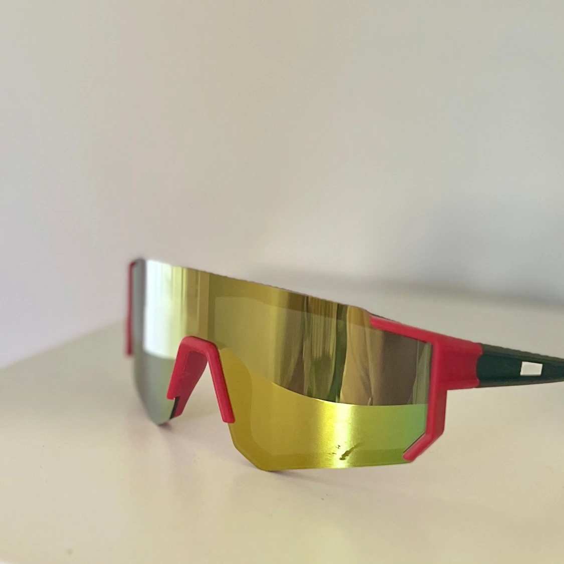 Säljer ett par futuristiska barn sportglasögon med spegelglas i guld och grönt. Ramen är röd framtill och svart på skalmarna, med en cool, kantig design. Perfekta för dig som vill sticka ut på träningen eller cykelturen😎