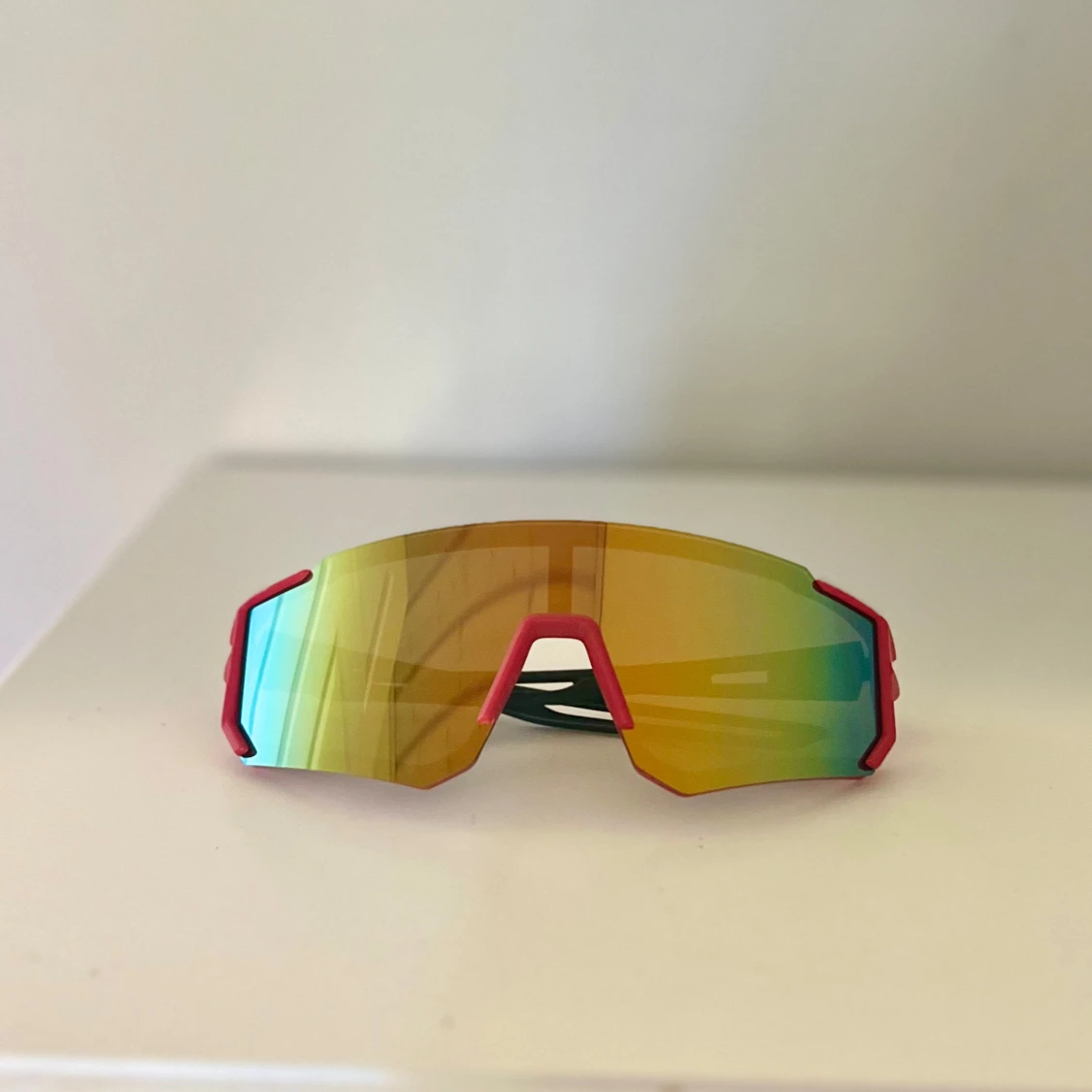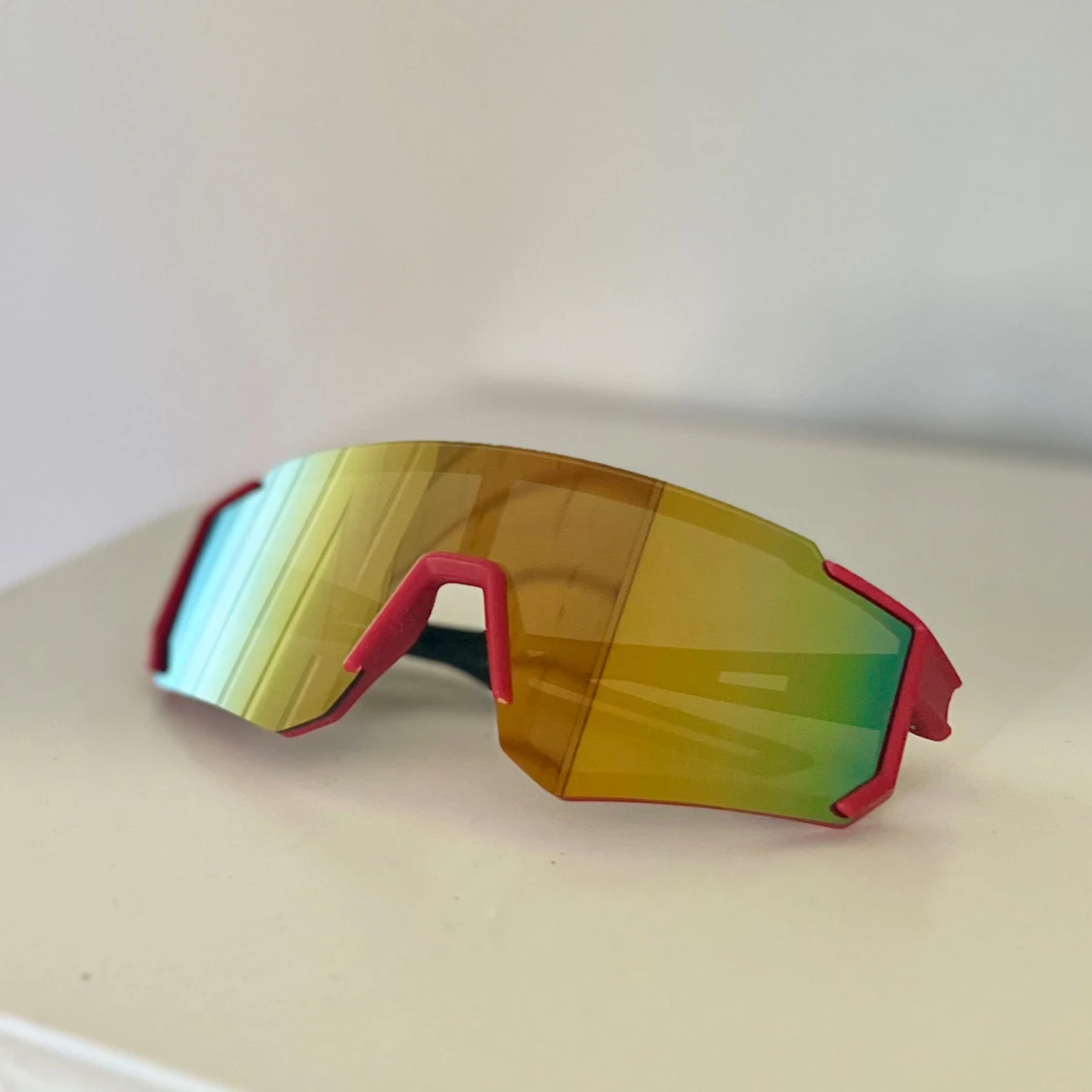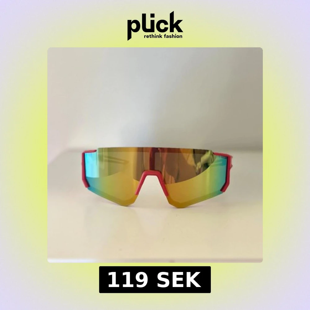 Säljer ett par futuristiska barn sportglasögon med spegelglas i guld och grönt. Ramen är röd framtill och svart på skalmarna, med en cool, kantig design. Perfekta för dig som vill sticka ut på träningen eller cykelturen😎