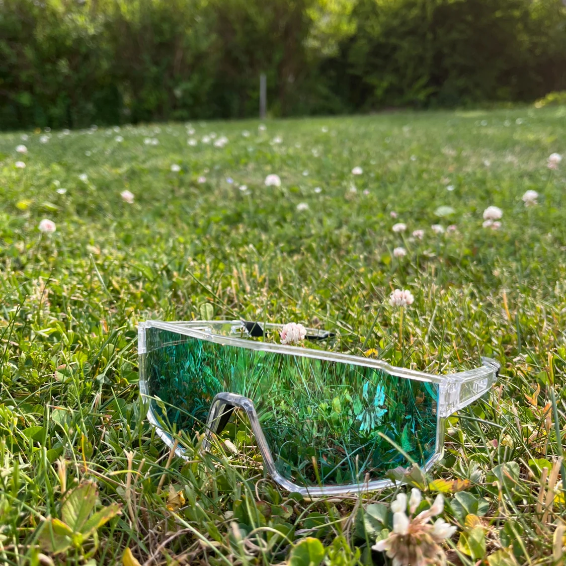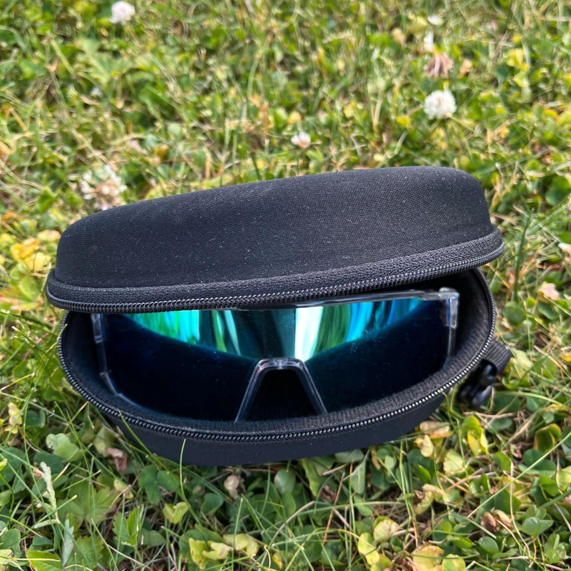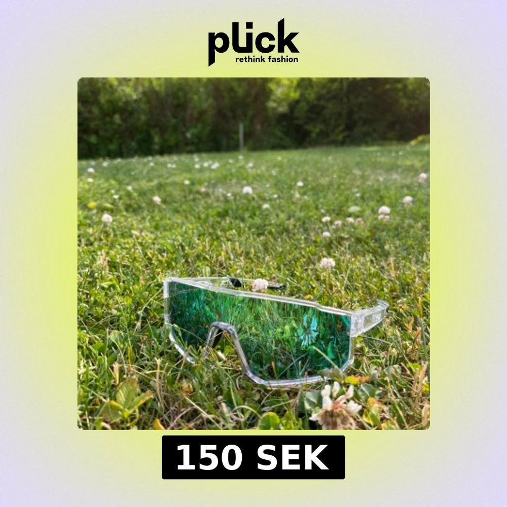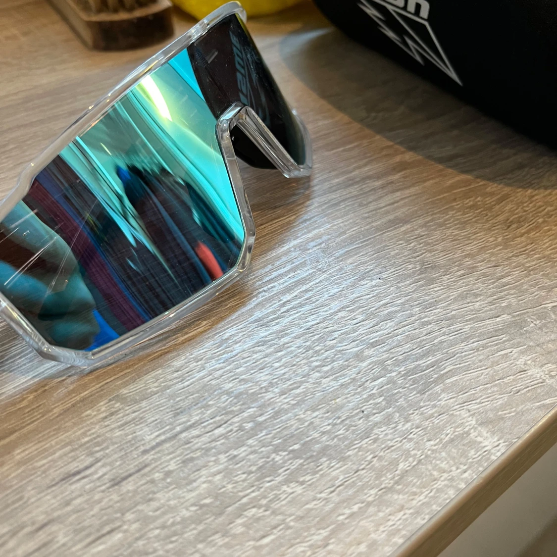 Säljer ett par sportiga solglasögon med spegelblå lins och transparent båge. De har en futuristisk, rektangulär form och passar perfekt för utomhusaktiviteter. Kommer med ett svart fodral för enkel förvaring.