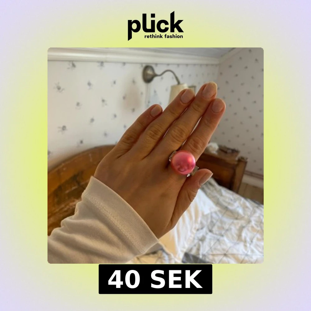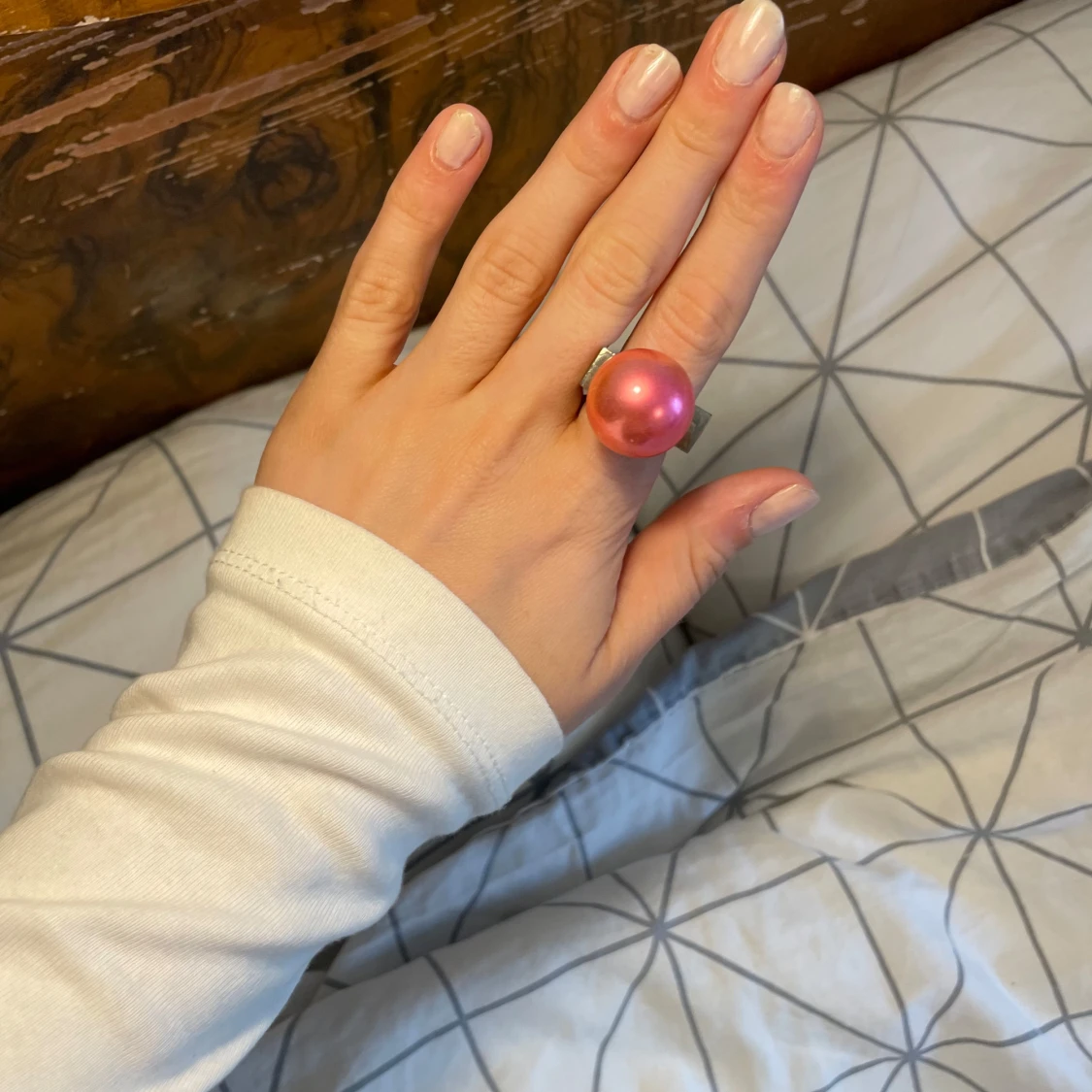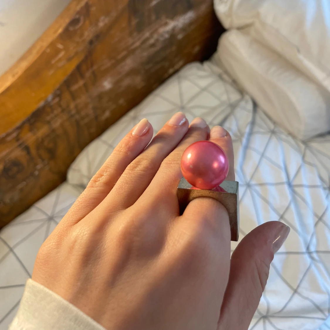 Cool ring med en stor, glansig rosa pärla på en bred, fyrkantig silvrig ringbas. Ringen har en modern och edgy design som verkligen sticker ut och ger en unik vibe till din stil. Som man kan se på den sista bilden är färgen en aning avskavd, det är inget man tänker på när man har den på sig.