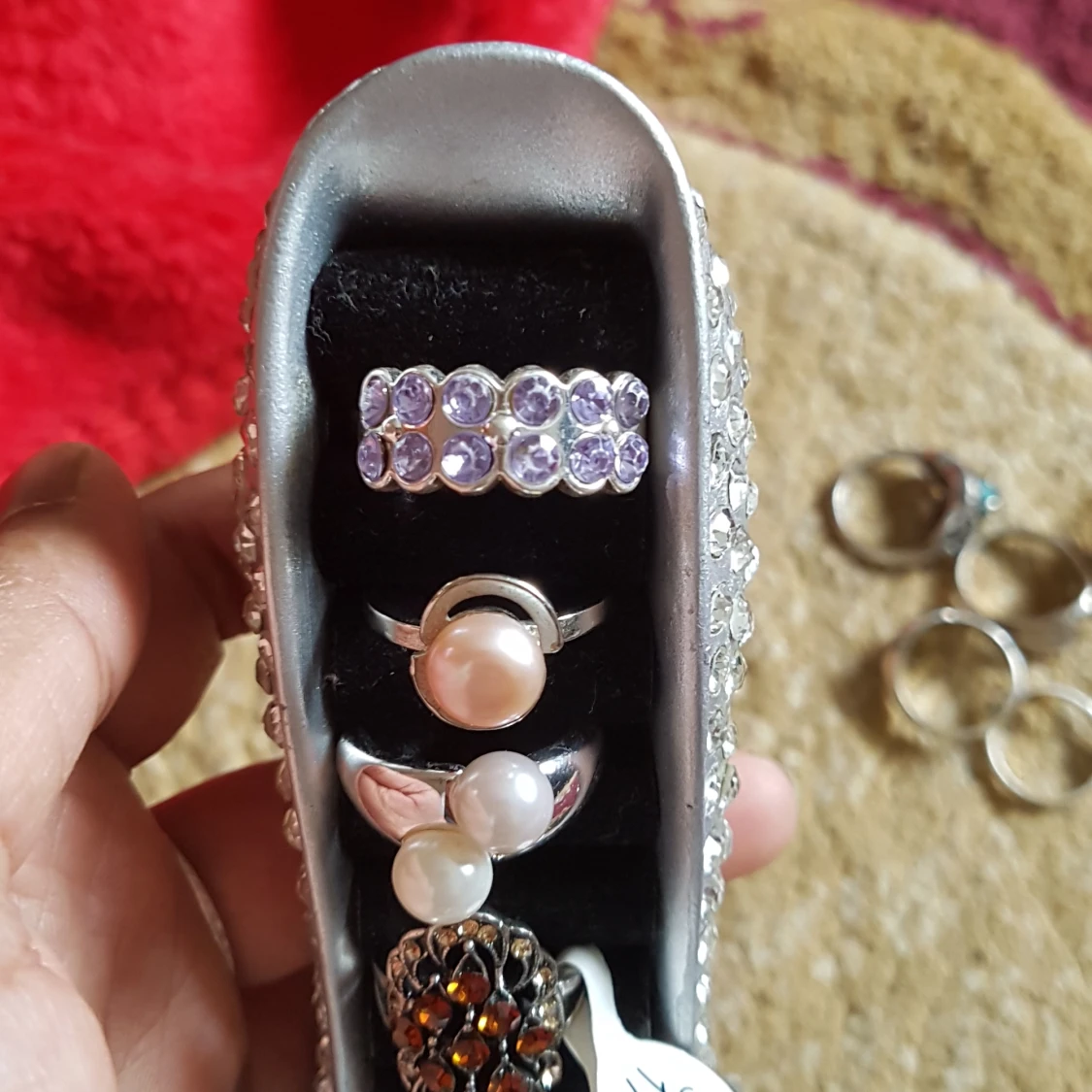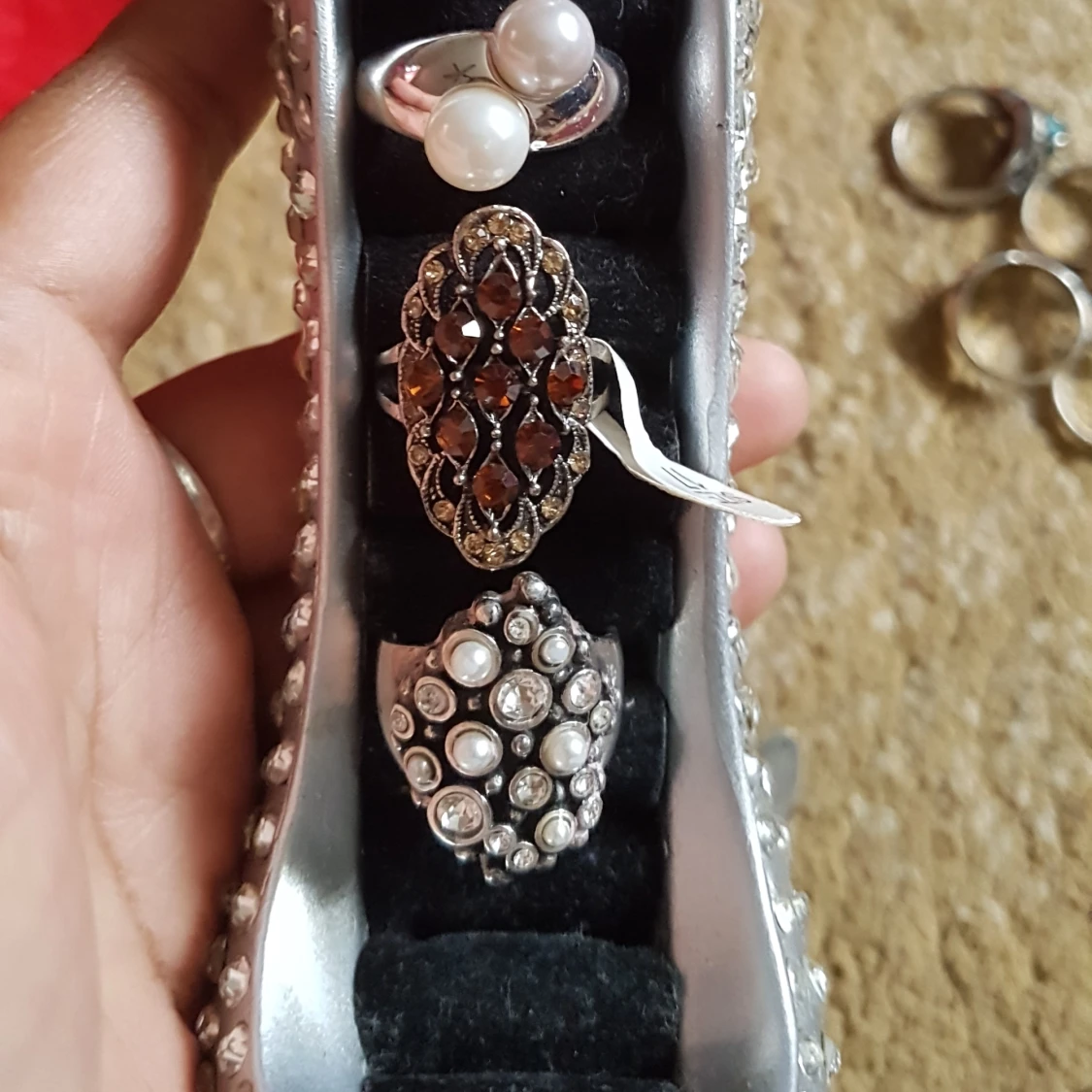 Fint ring med sten och pärlor. Första 2är st 18 . Andra är 17. . Första ring 50kr andra och tredje 60kr/st De sista 2 är 120kr/st. Plus Frak. Alla är helt