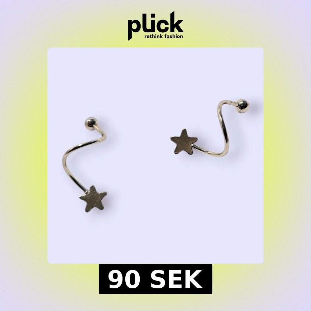 Säljer ett par örhängen i sterling silver 915 som har en minimalistisk design med små stjärnor längst ut. De har en öppen, böjd form och en liten kula på ena änden. Perfekta för dig som gillar enkla men unika smycken med lite edge.