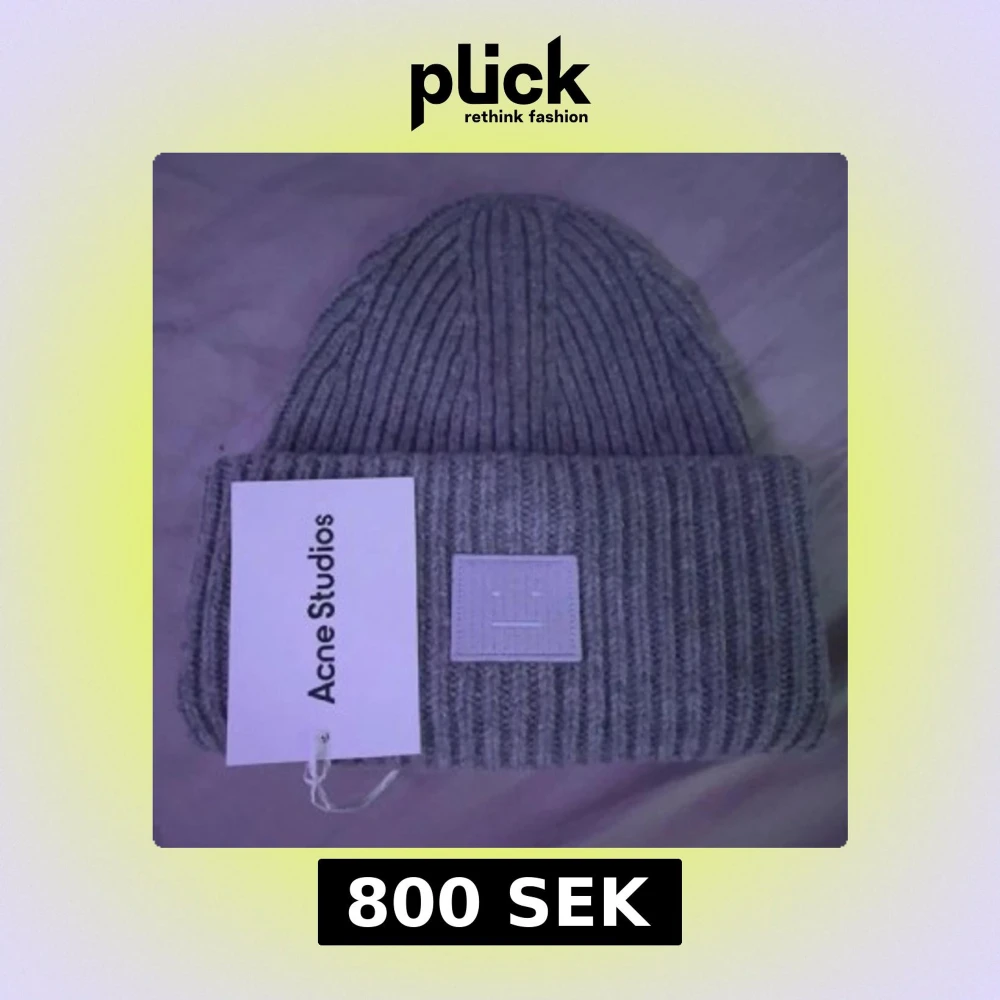 Säljer en grå ribbstickad mössa från Acne Studios med det ikoniska face-patch framtill. Mössan är i mjuk ull och har en bred uppvikt kant. Perfekt accessoar för kalla dagar och snygg till streetwear eller casual outfits.