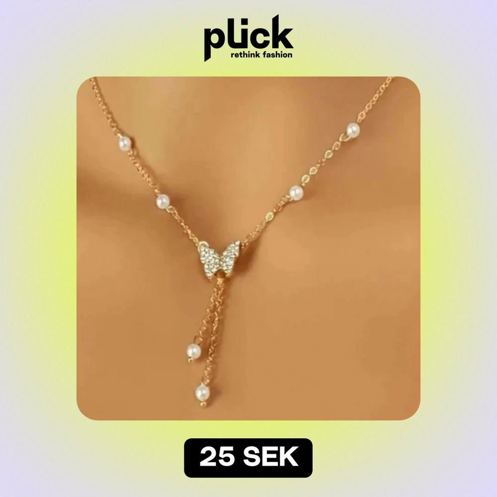 Säljer ett elegant guldhalsband med en vacker fjärilsdetalj i mitten. Halsbandet har små pärlor jämnt fördelade längs kedjan och två hängande kedjor med pärlor i slutet. Råkade beställa dubbletter ☺️