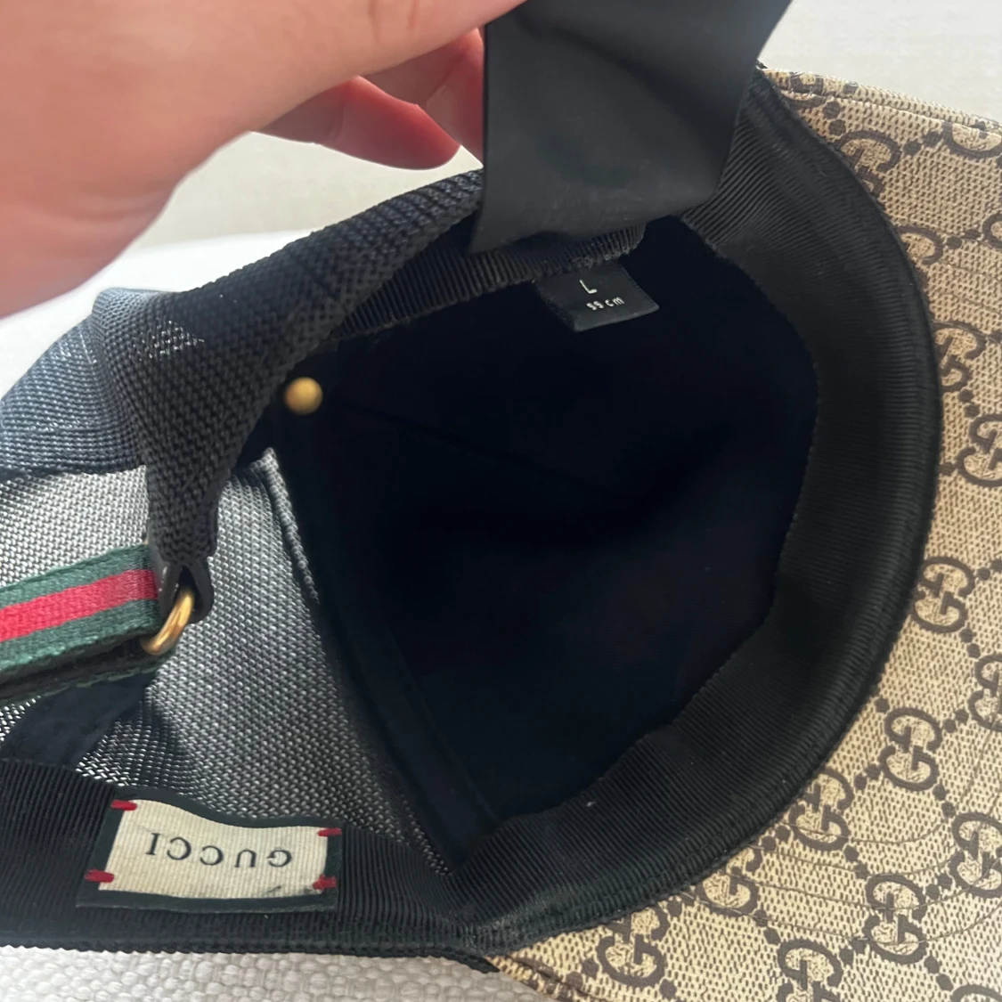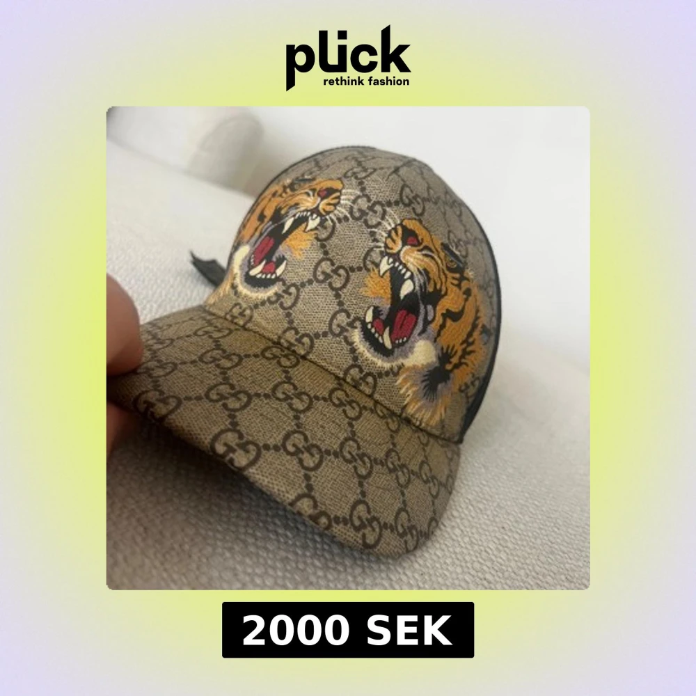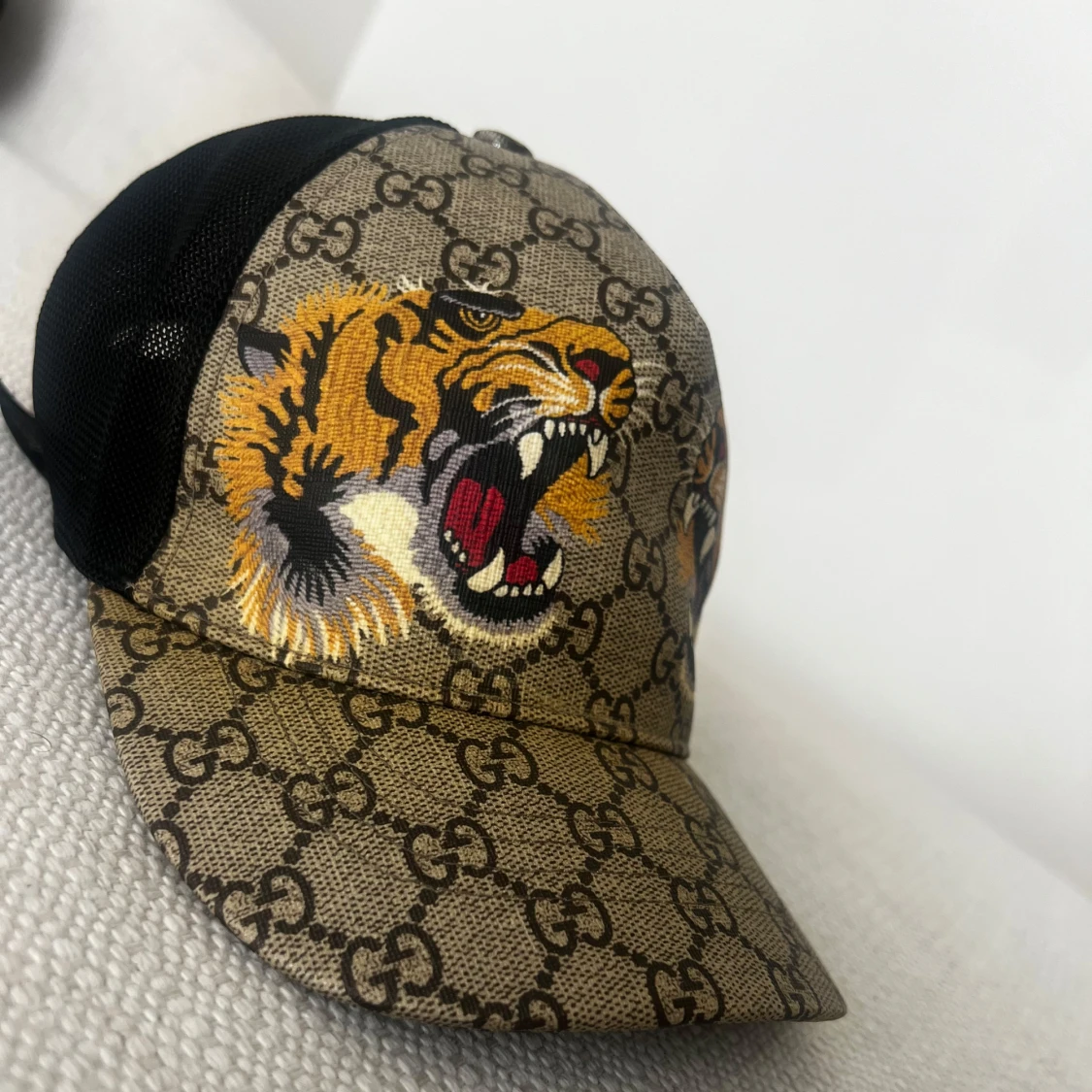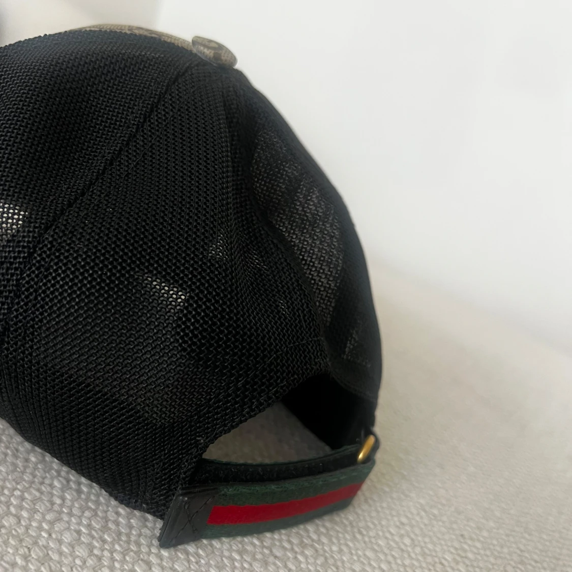 Snygg keps från Gucci med ikoniskt mönster och tufft tigertryck. Kepsen har en beige bas med svart mesh på baksidan och justerbart band i grönt och rött. Perfekt för att ge din outfit en lyxig touch.