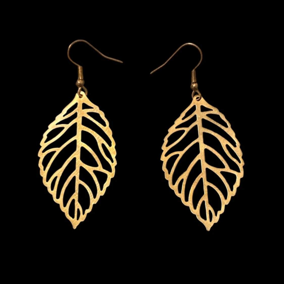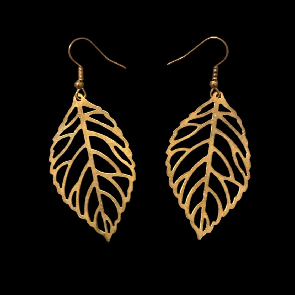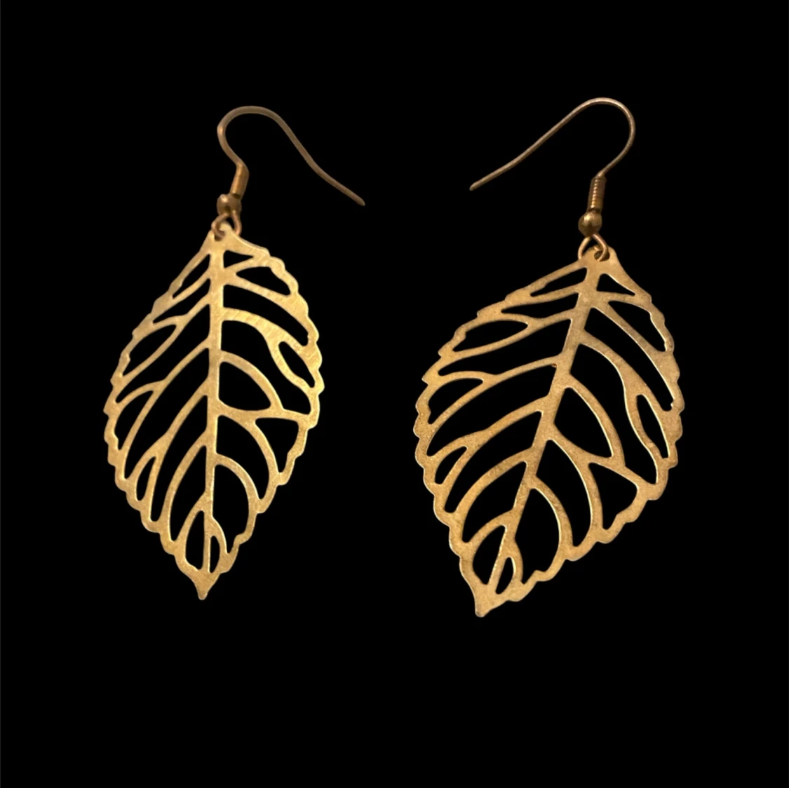 Snygga örhängen i form av blad med ett detaljerat, utskuret mönster. De är guldiga och har en lätt och luftig design som verkligen sticker ut. Perfekta för dig som vill ha något unikt och naturinspirerat i din stil.