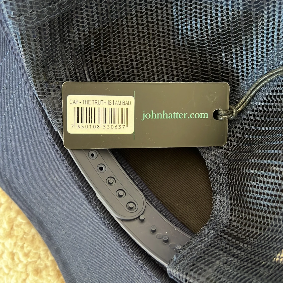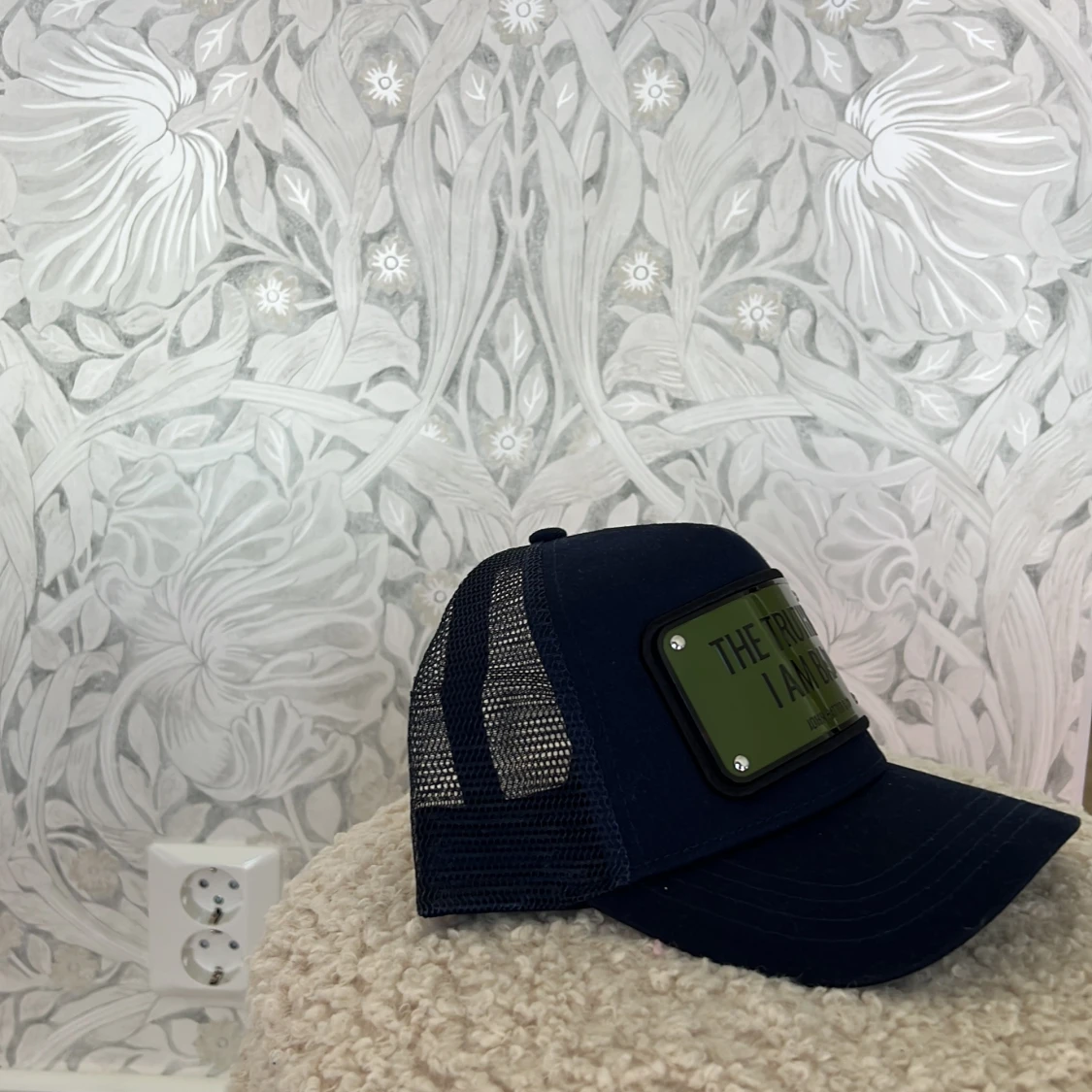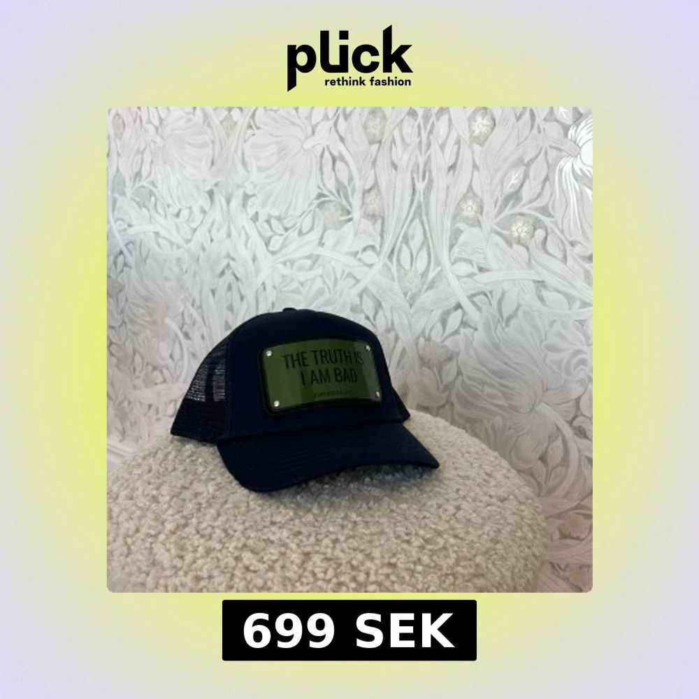 Mörkblå keps från John Hatter & Co med mesh på sidorna och justerbar snapback. Framtill sitter en grön skylt med texten 'THE TRUTH IS I AM BAD' i svart. Snygg och edgy accessoar som sticker ut. Kepsen är helt ny säljer då den inte passa min huvudform