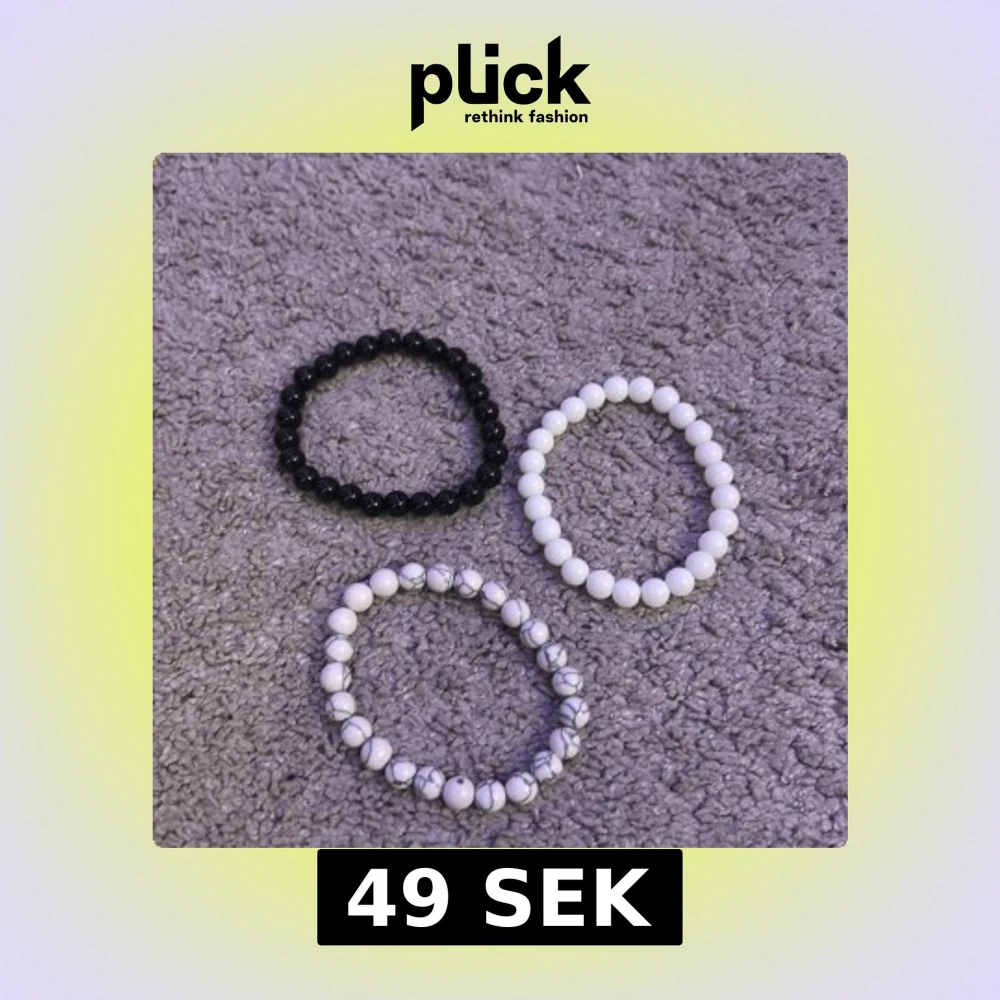 Säljer tre elastiska armband med pärlor i olika färger: ett svart, ett vitt och ett med vit och grå marmorering. Perfekta för att mixa och matcha beroende på stil och humör.